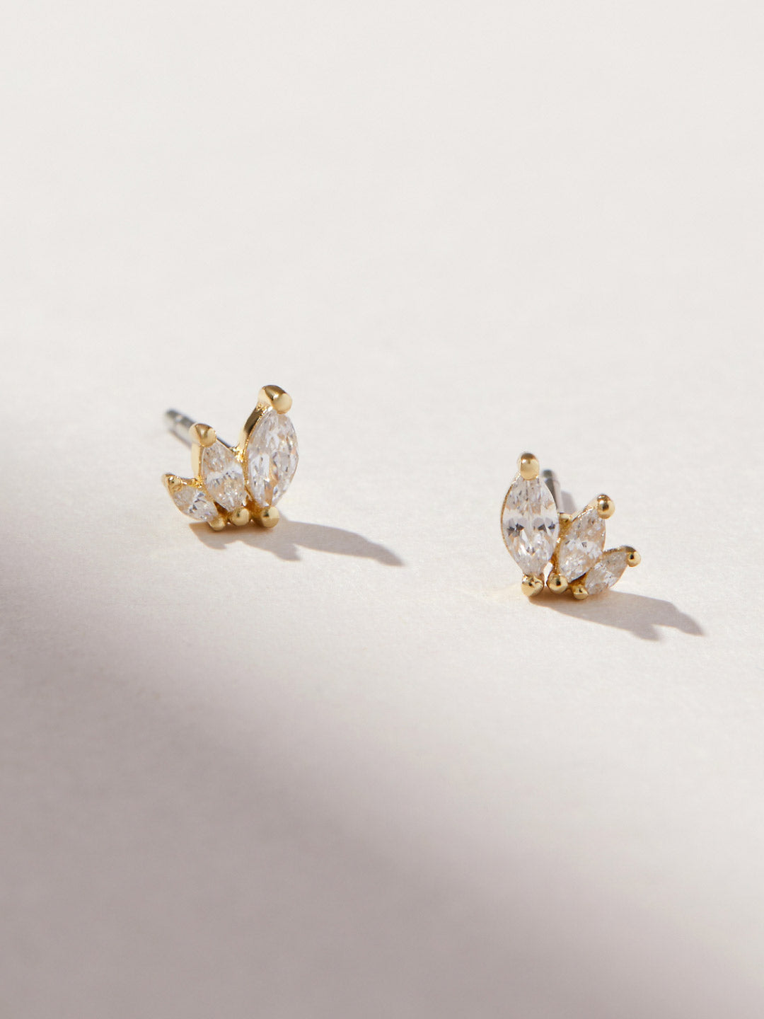 Three sparkling teardrop cubic zirconia gemstones dot each of these gold stud earrings crafted in recycled Sterling Silver and dipped in 14K gold. Lightweight and simple, these earrings are all you need to add just the right amount of sparkle to both casual and formal outfits. Wear these gold stud earrings along with other earrings for a bold look.