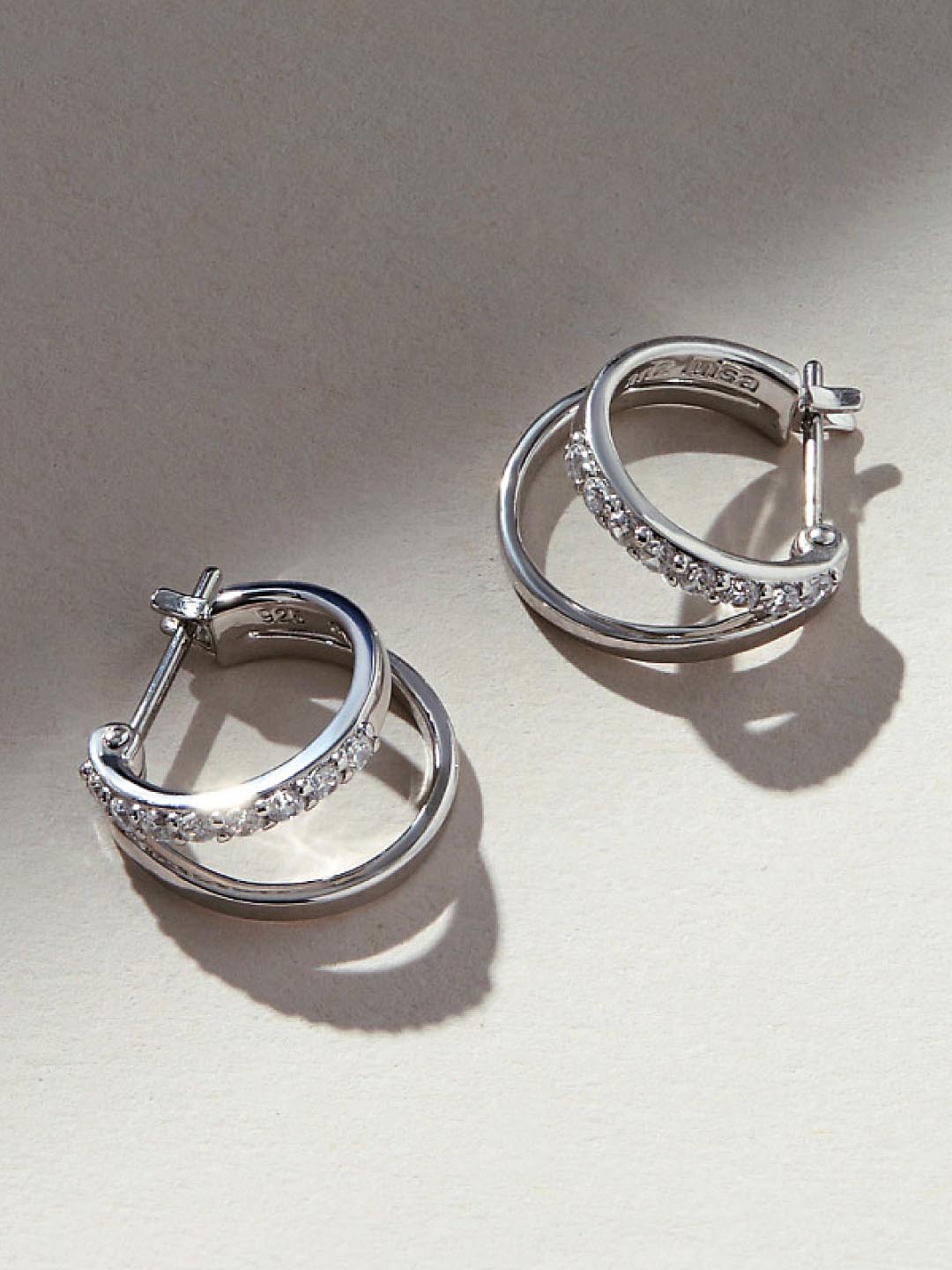 For all of our silver savants out there, we made you these dainty double hoop earrings. These sterling silver huggie hoops feature two rings—one sleek, one littered with sparkling cubic zirconia gems. Wear these double hoop earrings with other silver jewelry. If you’re straying away from silver, our Toda earrings also come in gold!