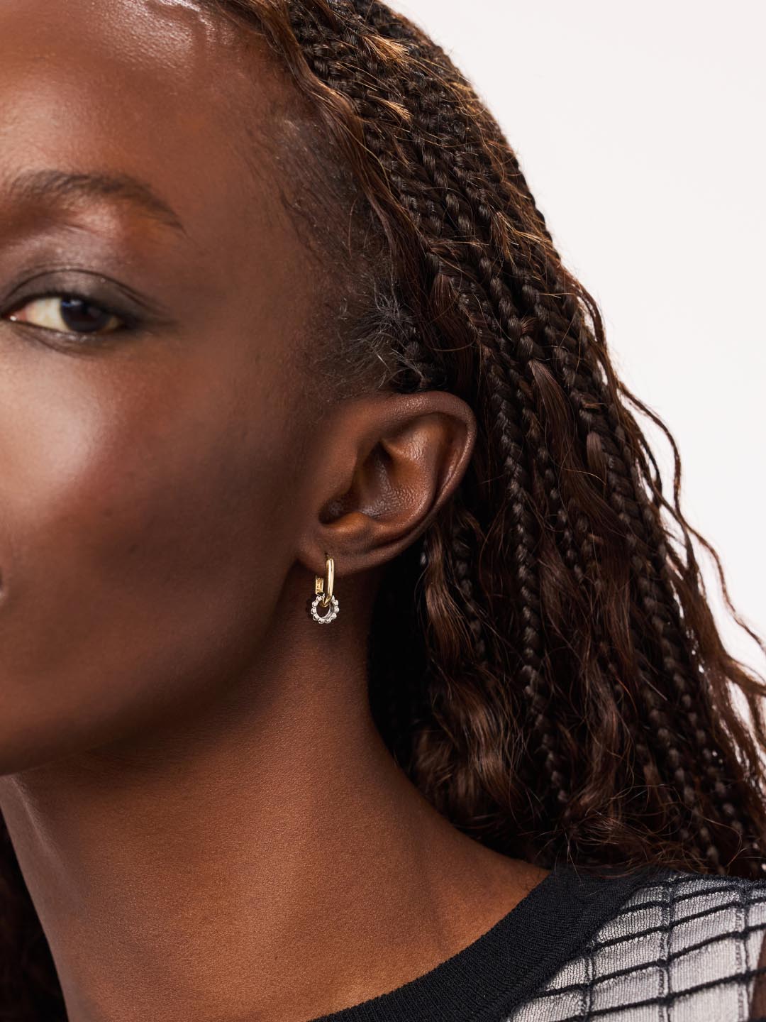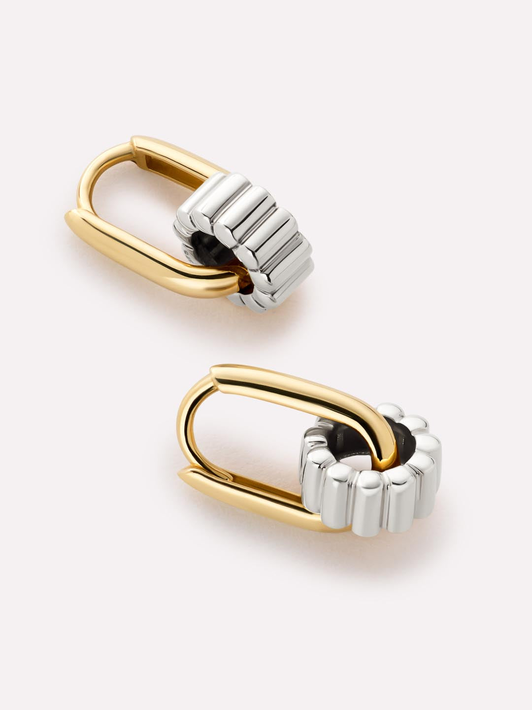 Add texture to every look with this solid yellow gold set. Crafted in recycled solid gold, this set features a pair of oval-shaped hoops and two textured charms in solid white gold. This one-of-a-kind set is a playful way to mix metals and adds something eye-catching to every stack. Style this earring set with our Gold Huggie Hoops for effortlessly easy stacking.