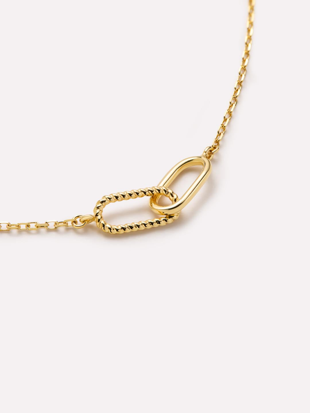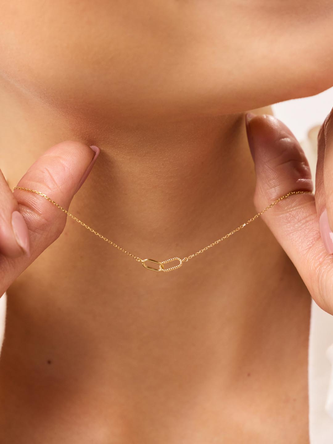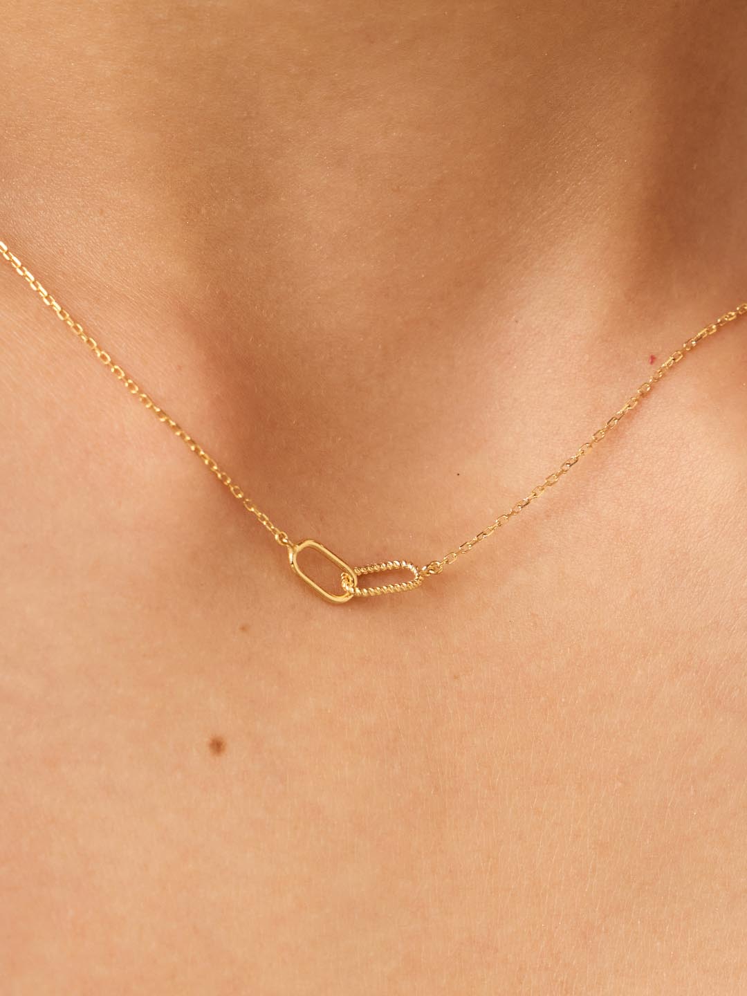 Whether you add it to your stack or wear it solo, this gold pendant is sure to elevate your look. Crafted in 100% recycled solid gold, this dainty necklace features two interlocking links, one with a smooth finish and one with a unique twisted design. Pair this necklace with our Gold Paperclip Necklace for an effortless everyday look.