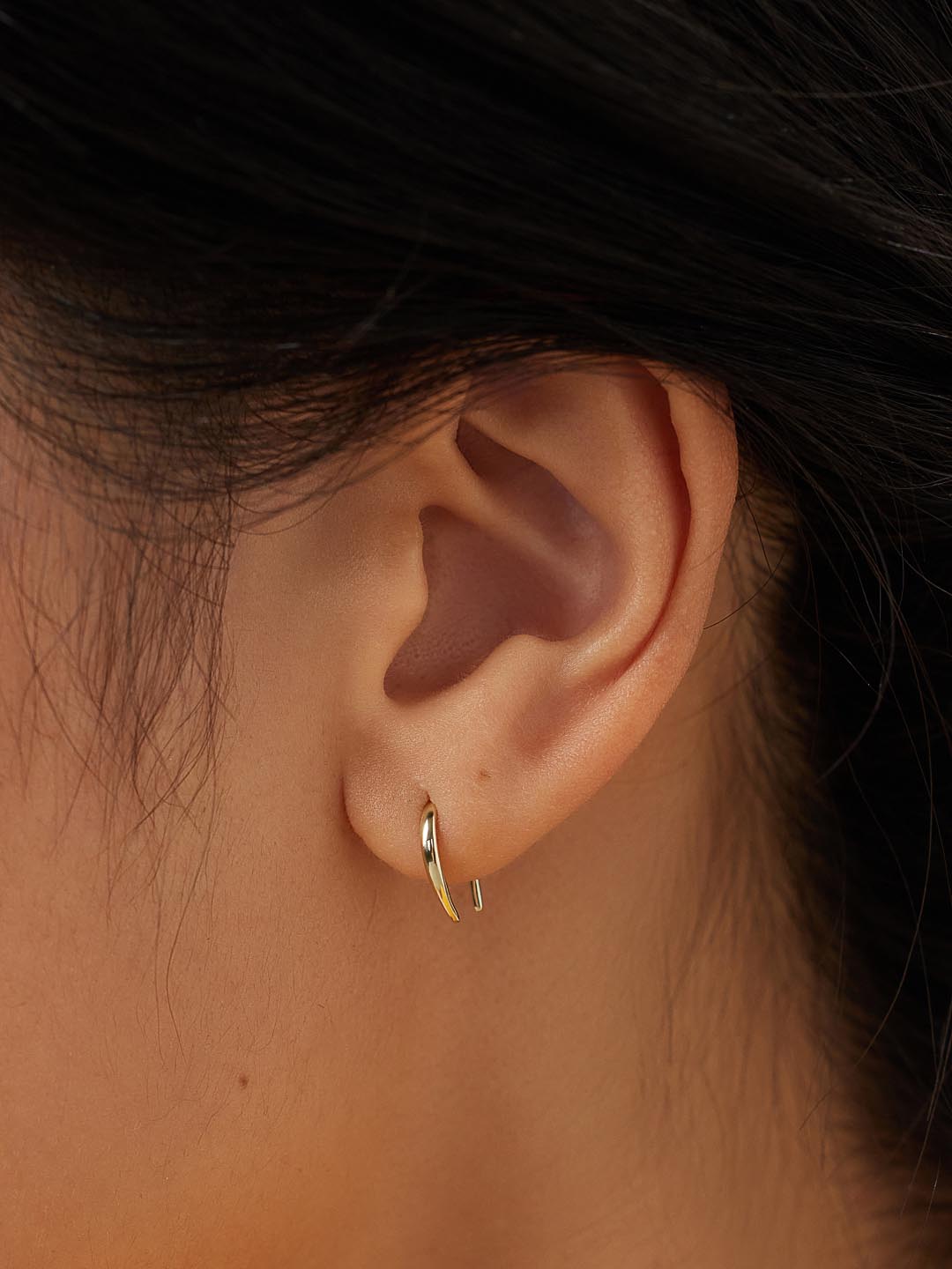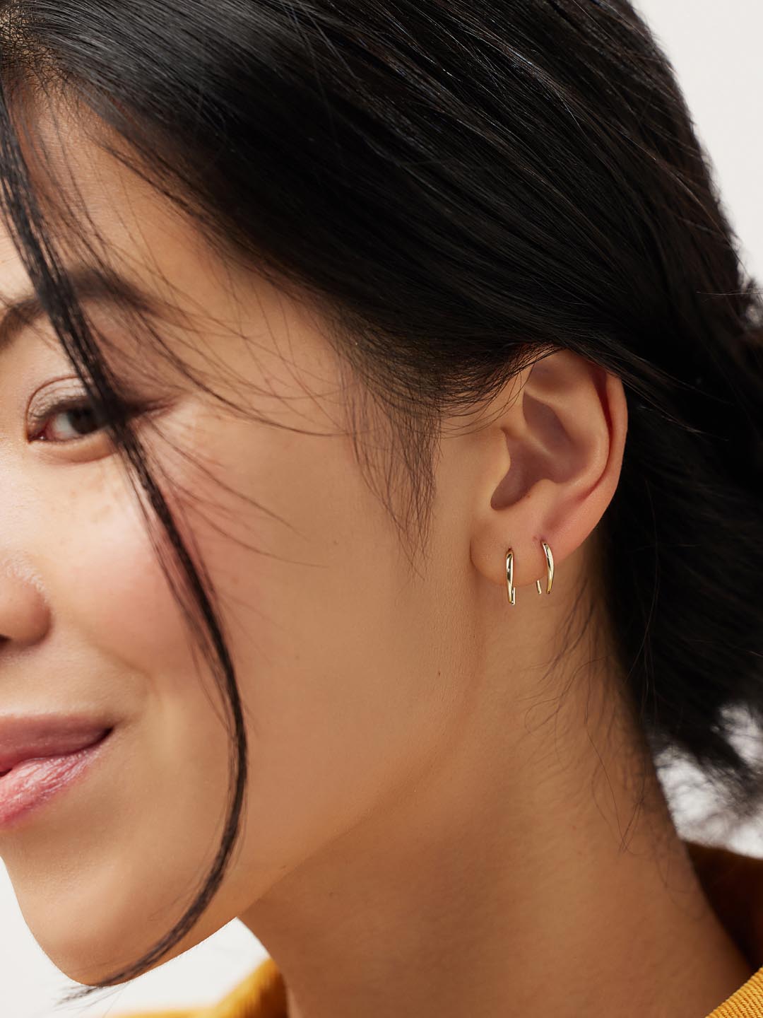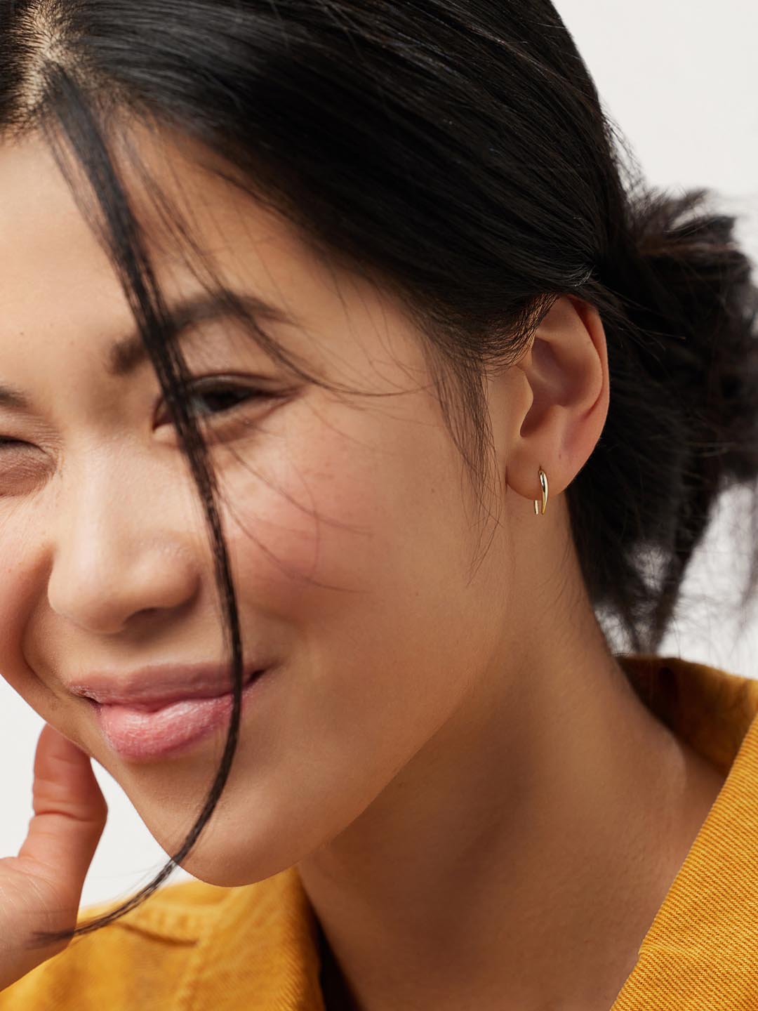 These hook earrings are bound to catch anyone's attention. Made of 100% recycled solid gold, their simple design is minimalistic yet elevated. Wear them alone or, for a classic hoop stack, pair them with our Gold Huggie Hoops.
