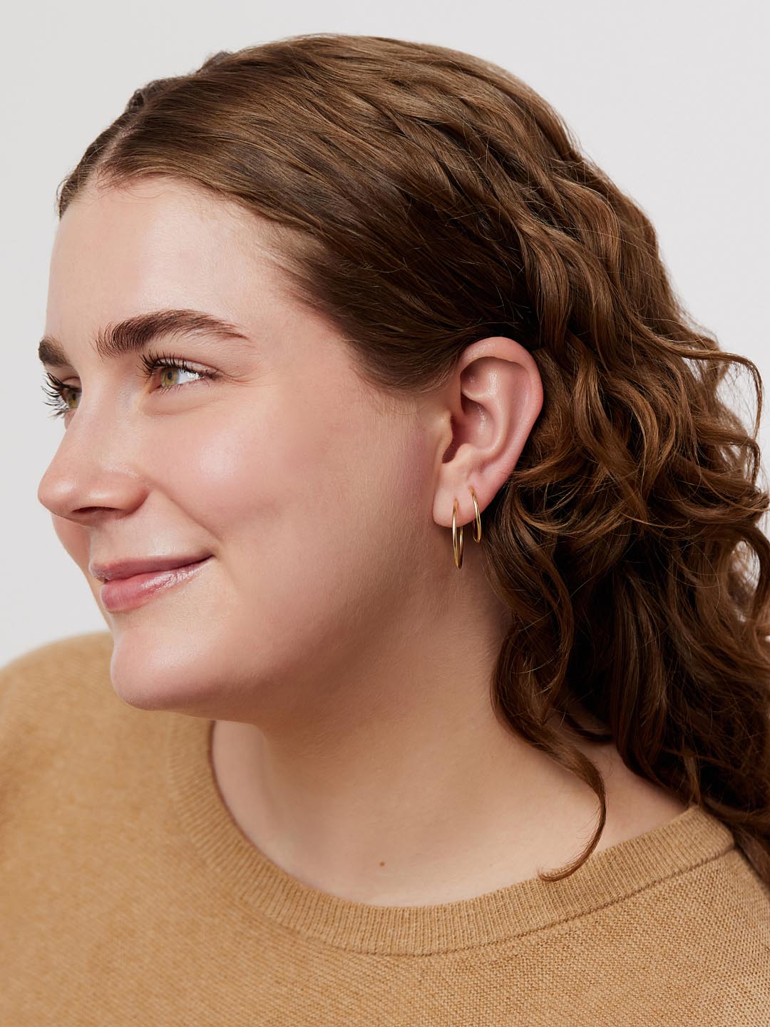 You’ll be heart eyes for hoops for these small gold hoop earrings. This staple hoop set crafted in solid gold features two pairs of our slim hoops in the medium and large sizes. Put the finishing touch on your sleek look and pair these hoops with our Gold Paperclip Necklace.