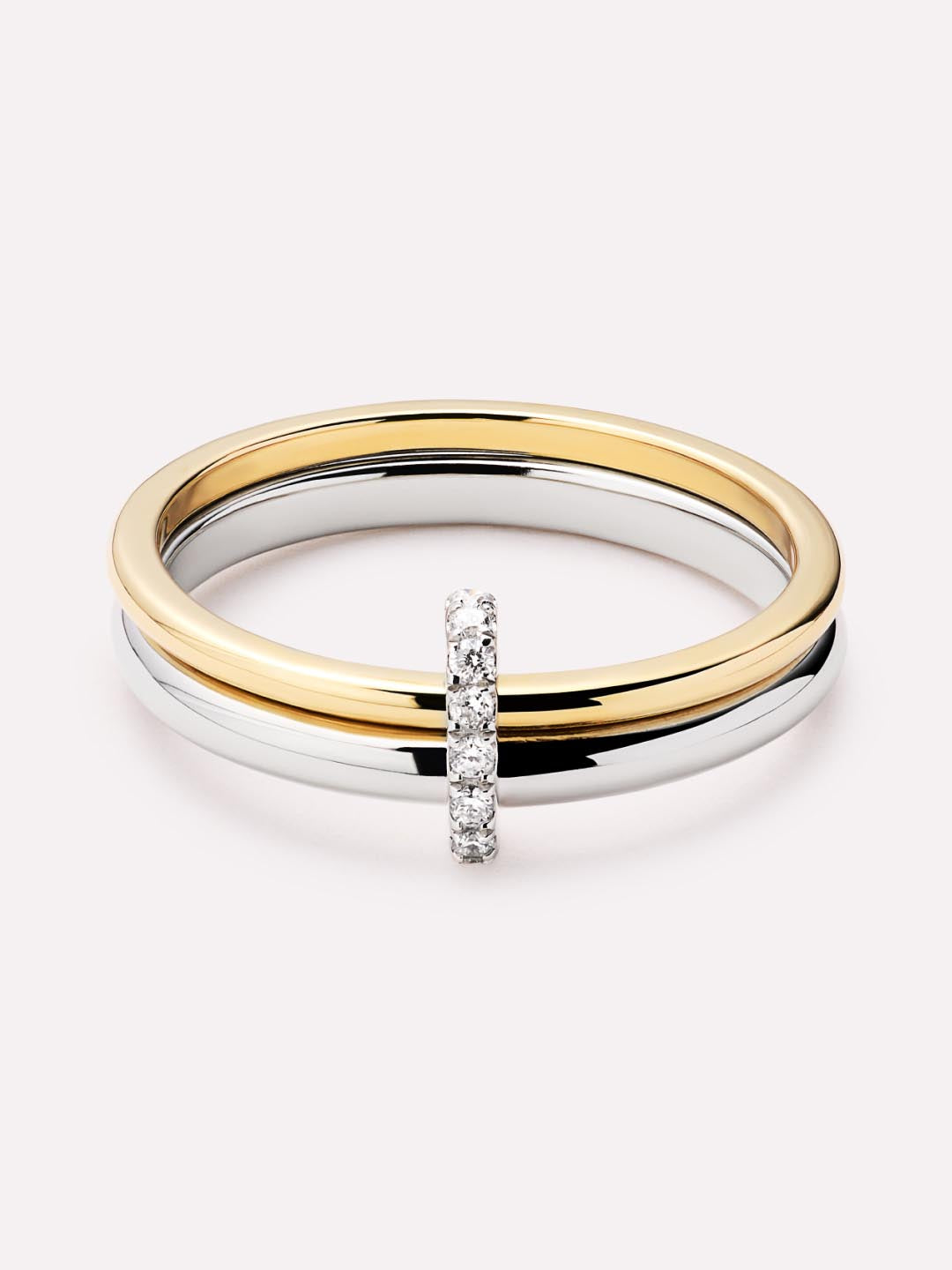 This solid yellow gold ring is an elevated way to mix your metals. This ring features two sleek bands, one in solid gold and one in shiny sterling silver, held together by a silver link with sparkly lab-grown diamonds. Style this two tone ring with our medium Gold Classic Hoops for a statement-making mixed metal look.