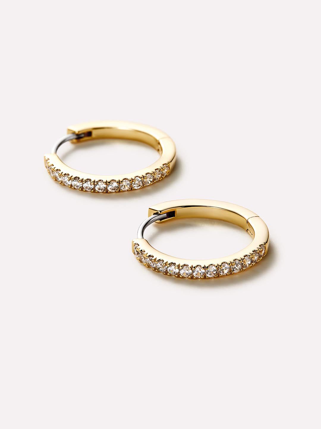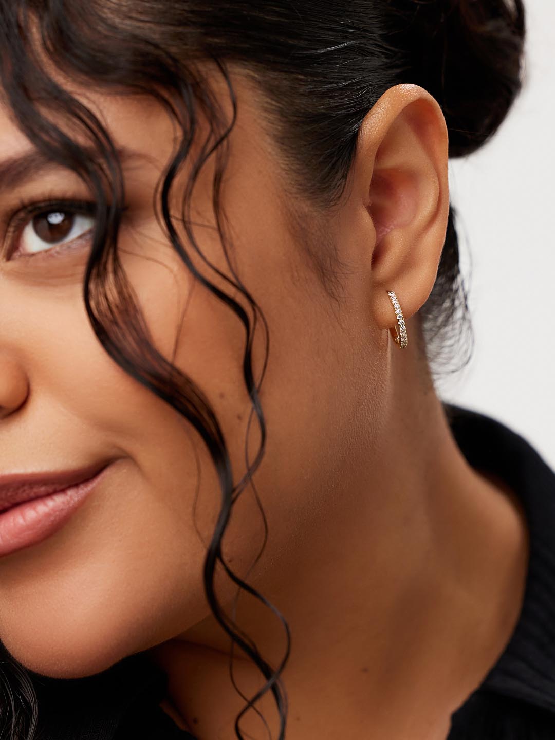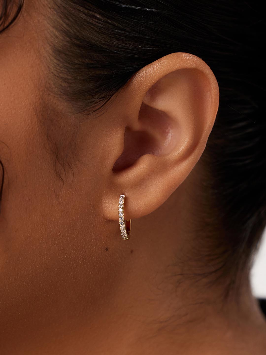 These gold huggie hoop earrings have the glam, the glitz, and sparkle you’ve been waiting for. A medium sized hoop with some extra sparkle? Yes, please. Add these gold huggie hoop earrings to your earring stack or wear on their own for a totally golden moment. These beauties pair well with our Ana Gold necklace, as well as any gold earrings in your go-to stack.