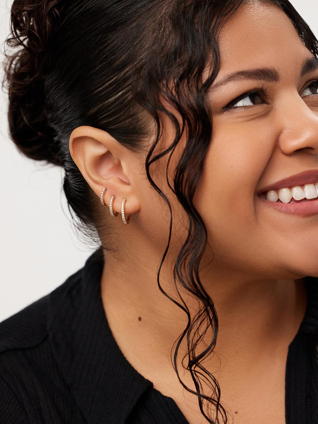 Pave the way in style with these gold huggie hoop earrings, the hoops you won’t be able to accessorize without. Made with 14k gold plating and a stunning row of gems, these gold huggie hoop earrings fit perfectly in any earring stack or steal the show on their own. Style with our Tia Mini earrings for a golden combo.