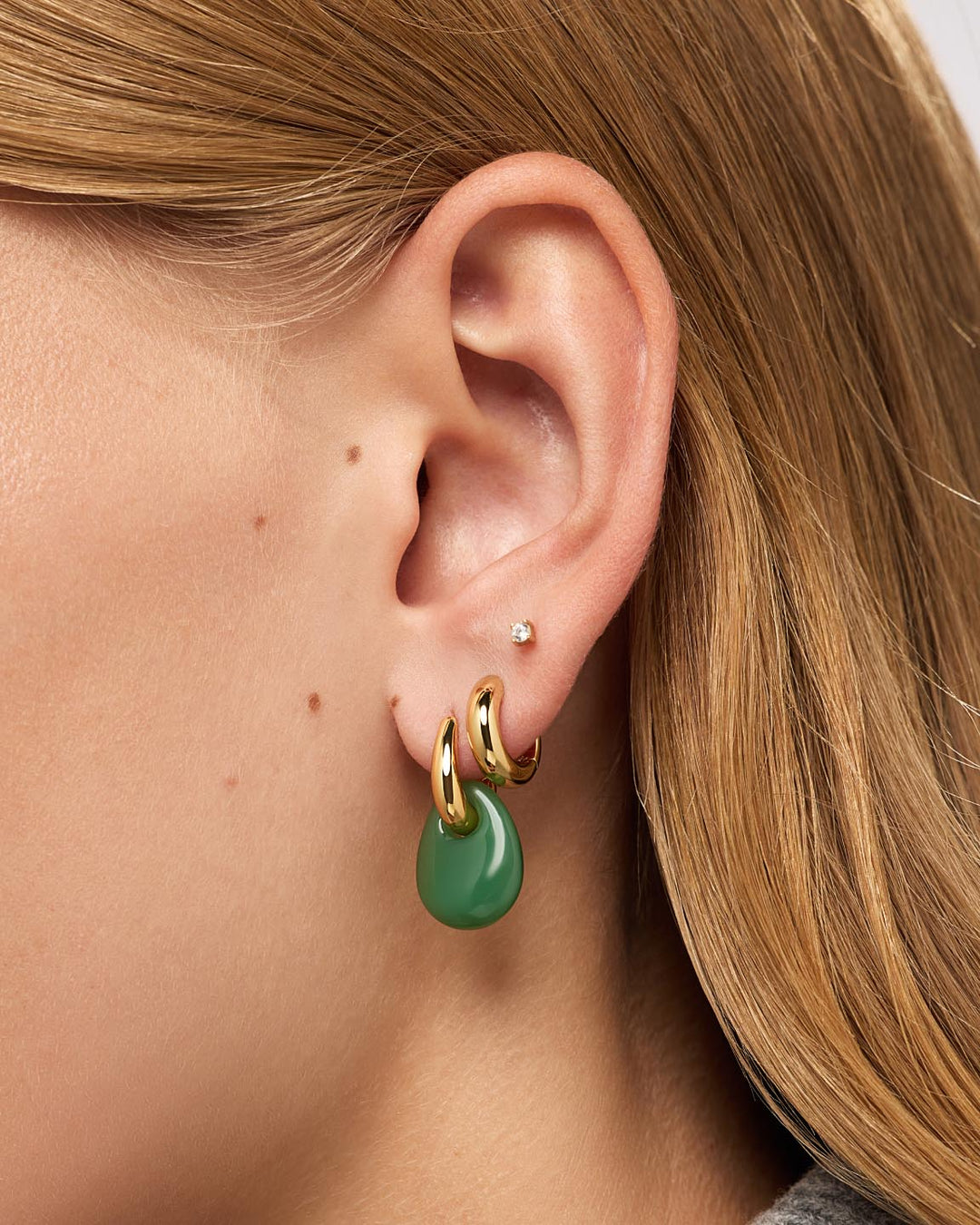 These gold drop earrings are made with 14k gold plating and responsibly sourced recycled glass. These gold drop earrings add a touch of color and sparkle to any earring stack. Wow on your next date night, elevate your office look, or get creative with your everyday stack. These gold drop earrings pair well with our Pebble necklace.