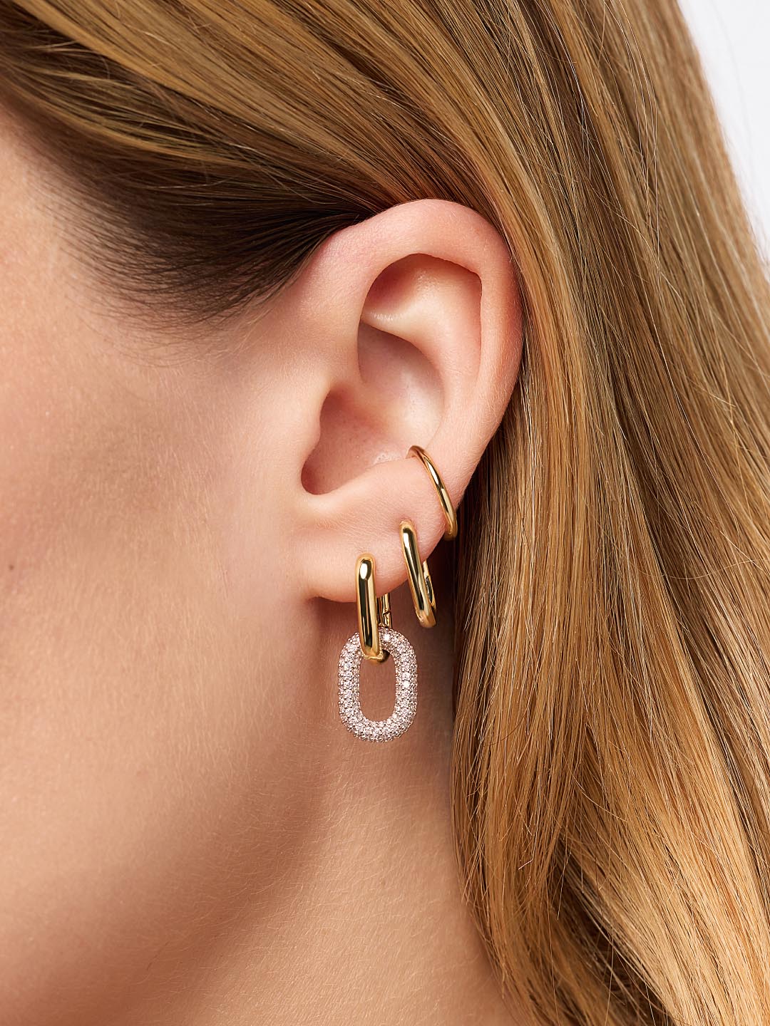 These drop earrings were made to go from day to night and everywhere in between. Plated in 14k gold and rhodium, these mixed metal earrings feature two interlocking links in an oval-shaped design with cubic zirconia gemstones for extra boldness. Stack these hoops with our Mini Huggie Hoops for an effortless occasion-ready look.