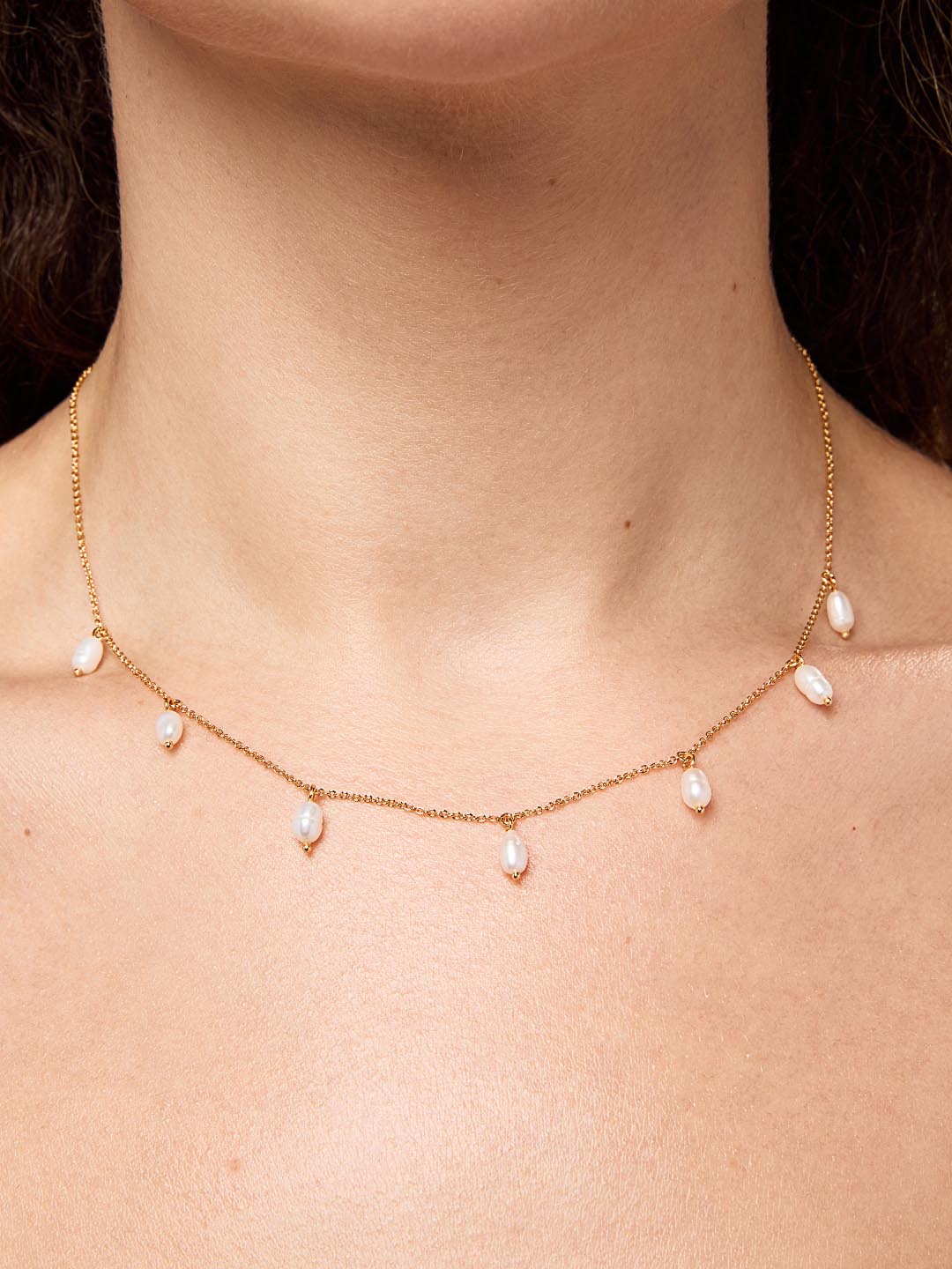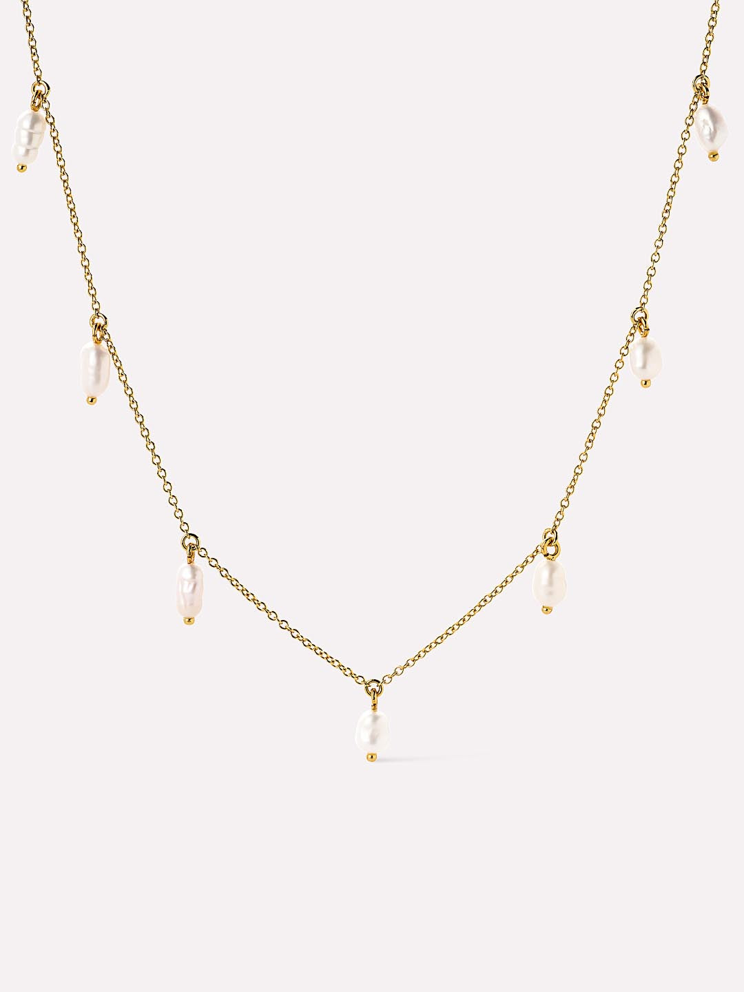 Simple yet chic, this gold pearl necklace is a timeless addition to your summer jewelry lineup. Inspired by the sea and plated in 14k gold, this necklace features dangling freshwater pearls designed to complement any neckline. Finish off your pearl-adorned look by styling this necklace with our Adelie bracelet.