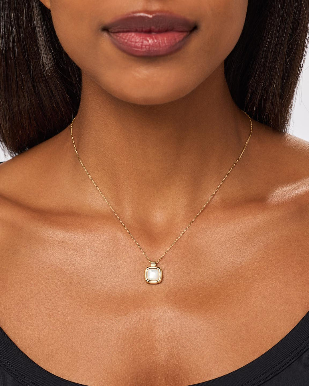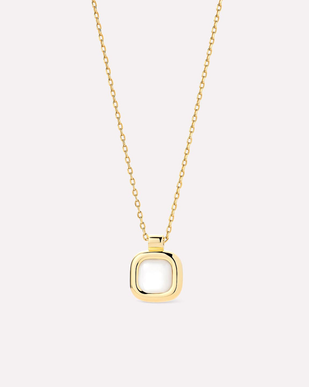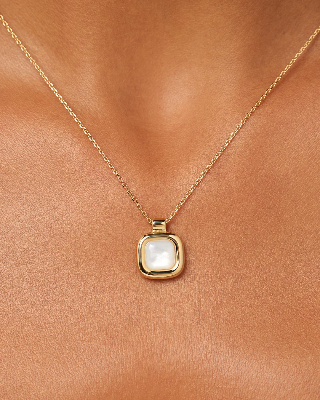 This gold pendant deserves the top spot in your jewelry collection. Plated in 14k gold, this necklace features a round square pendant with Mother of Pearl detail in the center. Style this pendant with our Giulia Bold Hoops to add effortless beauty to your look.