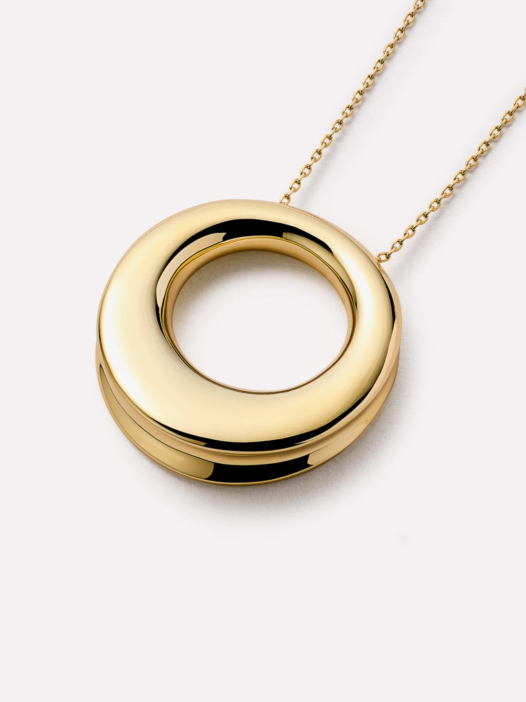 Picture this: you in your favorite top and this gold pendant necklace that perfectly completes the look. This 14k gold-plated pendant necklace features a simple chain and a circular pendant with concave detailing for a touch of elegance. Simply add this necklace to your favorite stack or pair it with our mini Wade Huggies for effortlessly easy styling.