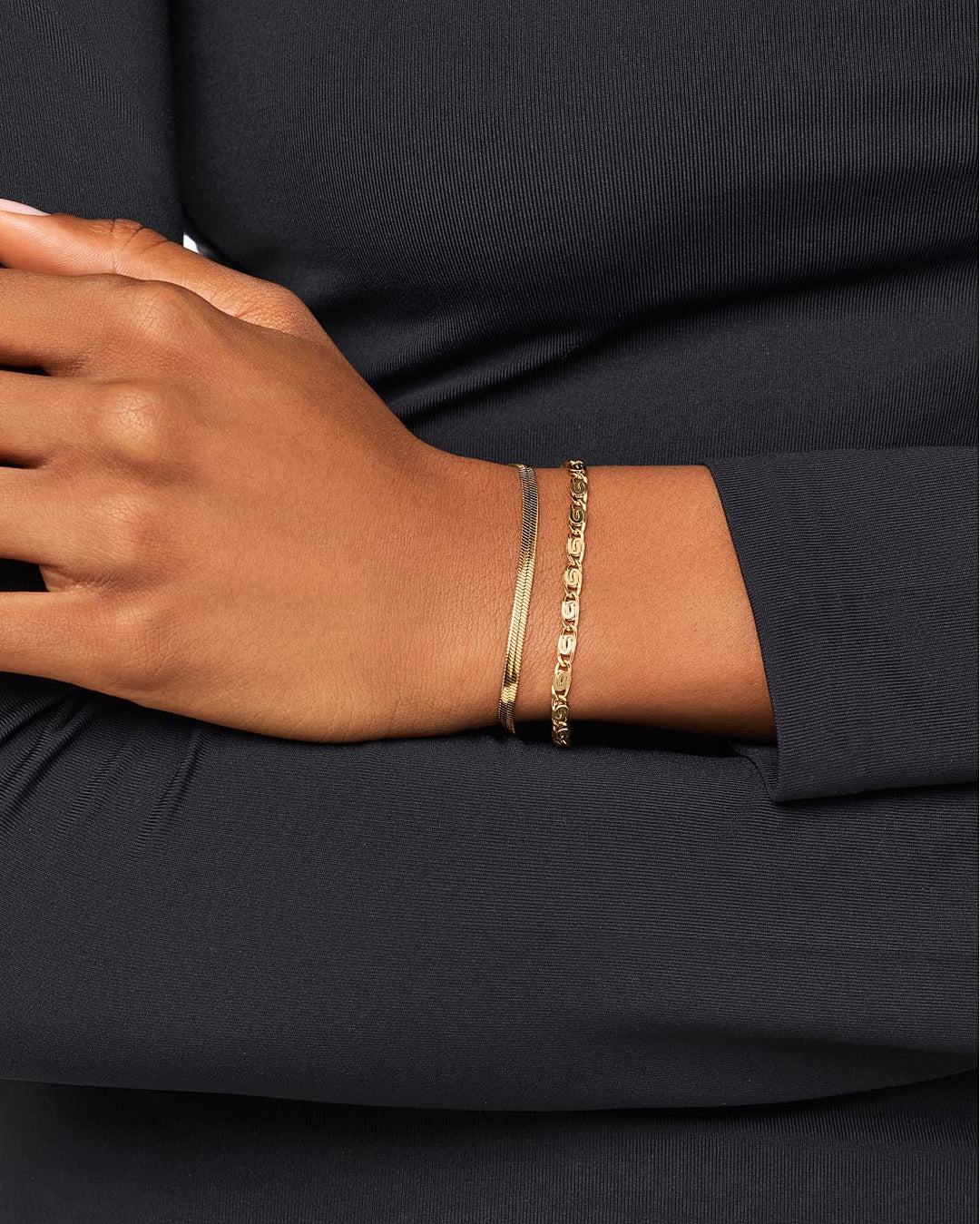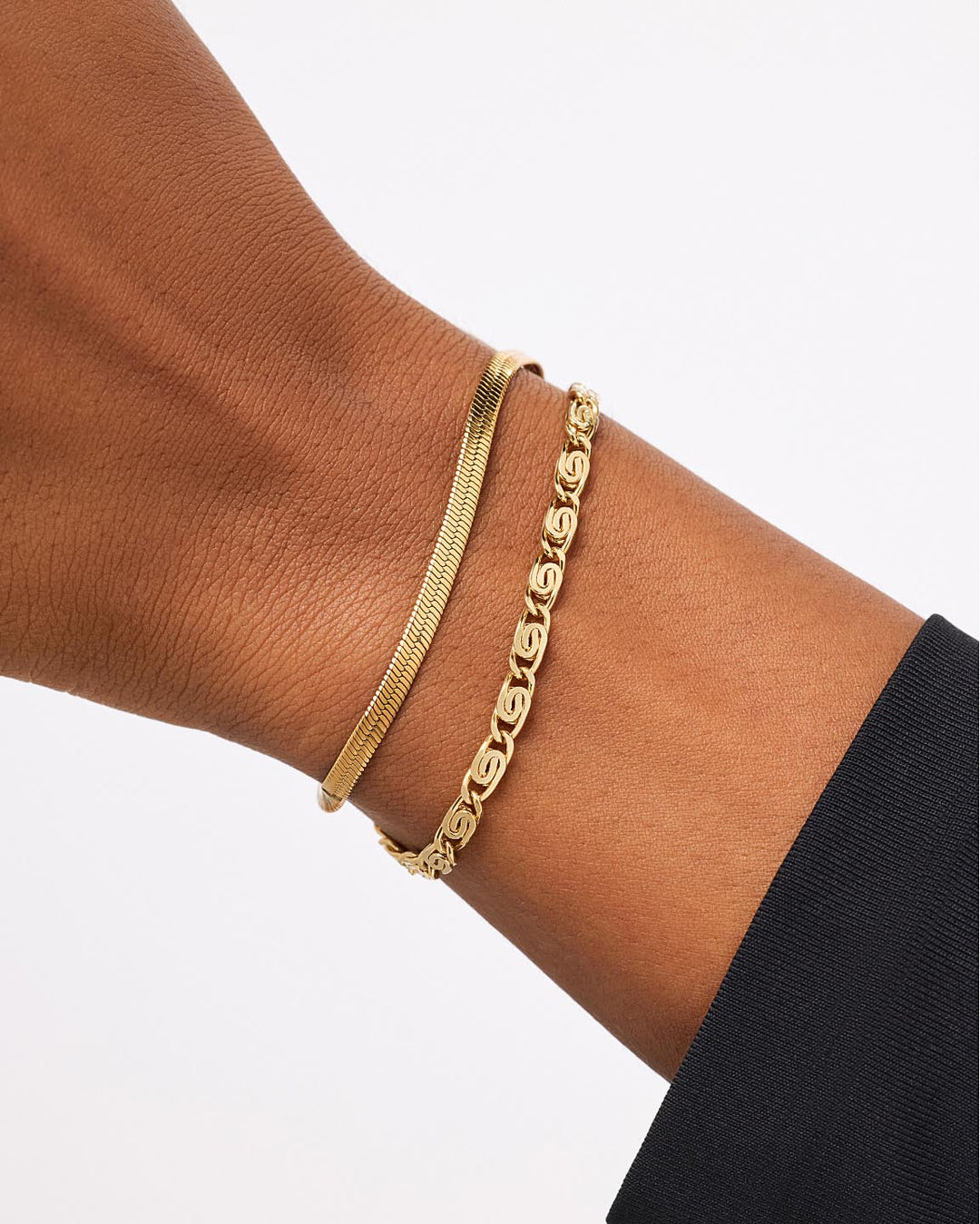 The Statement Bracelet Bundle includes two pieces: Herringbone Bracelet - Atlas and Gold Chain Bracelet - Navy Bracelet.