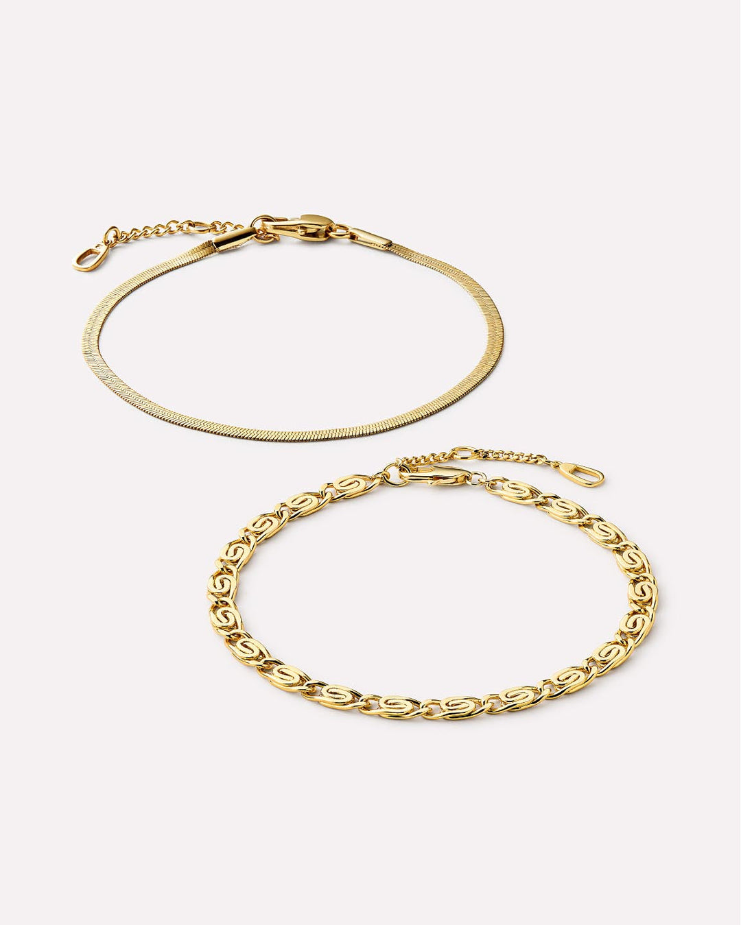 Add infinite shine to your stack with this Statement Bracelet Bundle. Plated in shiny 14k gold, this pre-styled set features two pieces in varying textures—a sleek herringbone bracelet and a bracelet with unique shell-inspired links. Style this eye-catching set with our Ina necklace to complete your look.