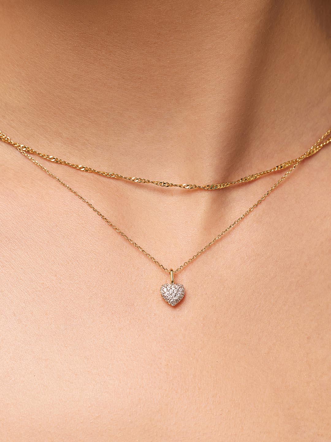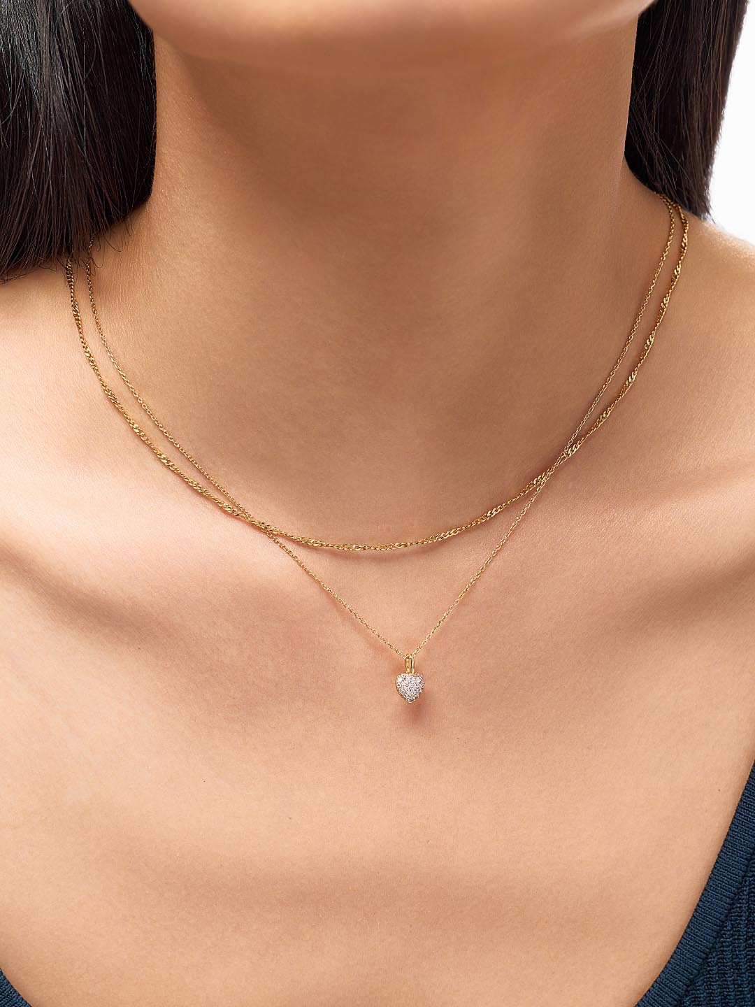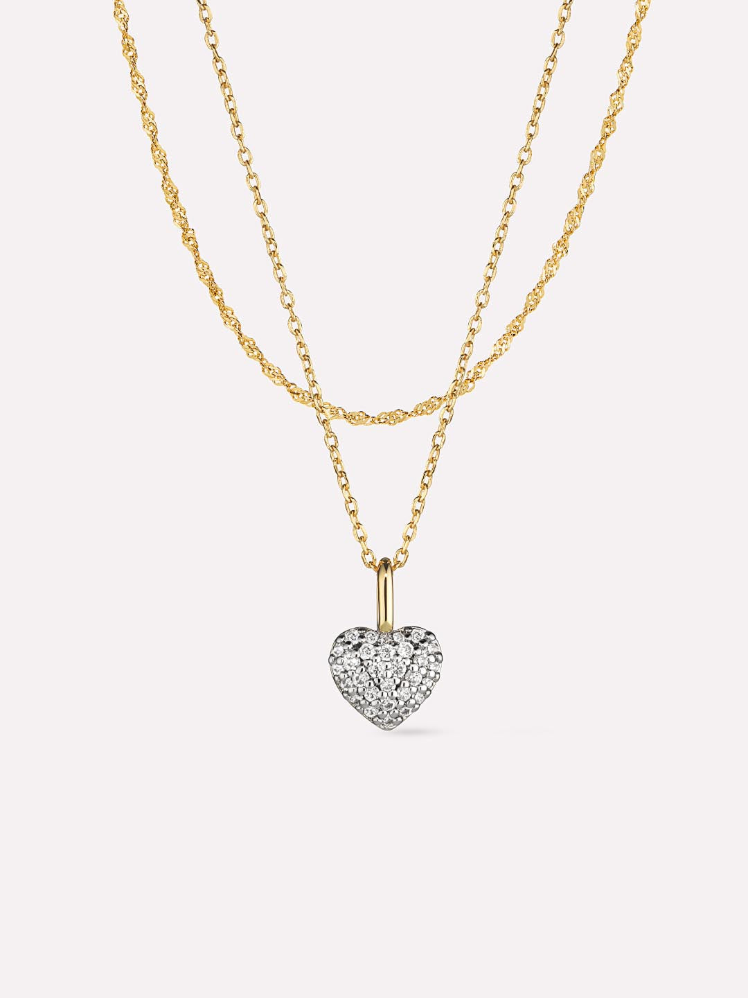 Our Twist of Love Bundle is the perfect combination of sparkle and texture. Plated in shiny 14k gold, this pre-styled necklace set features a timeless singapore chain and an embellished heart-shaped pendant. Although these pieces are perfect together, this versatile bundle can also be worn separately or with any of your favorite jewelry pieces for a personalized look. Add our Oren ring to your look for a timeless yet sparkly finishing touch.