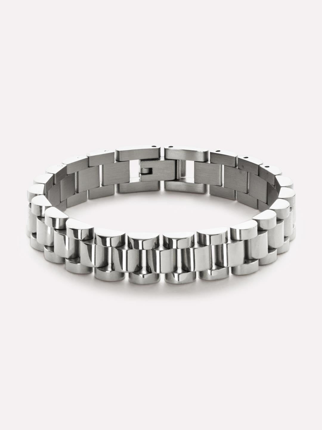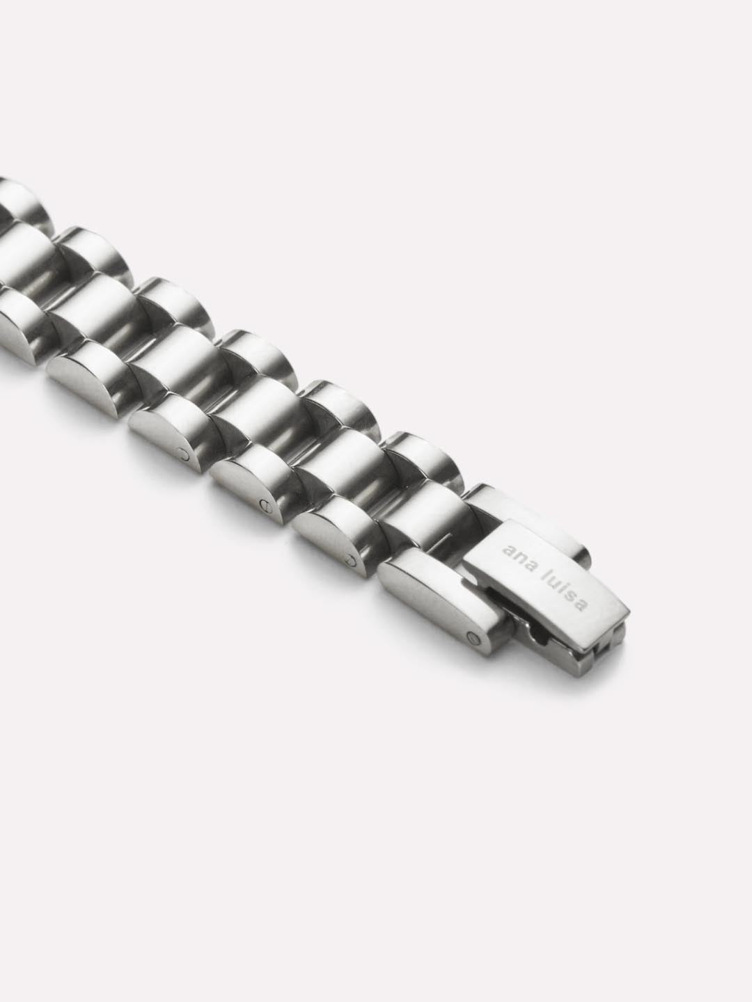 Add something classic to your look with this watch strap bracelet. Plated in shiny rhodium, this timeless piece inspired by luxury watch bands features a simple linked design that can be stacked or styled on its own. Pair this bracelet with our Eliora silver ring for the perfect elevated look.