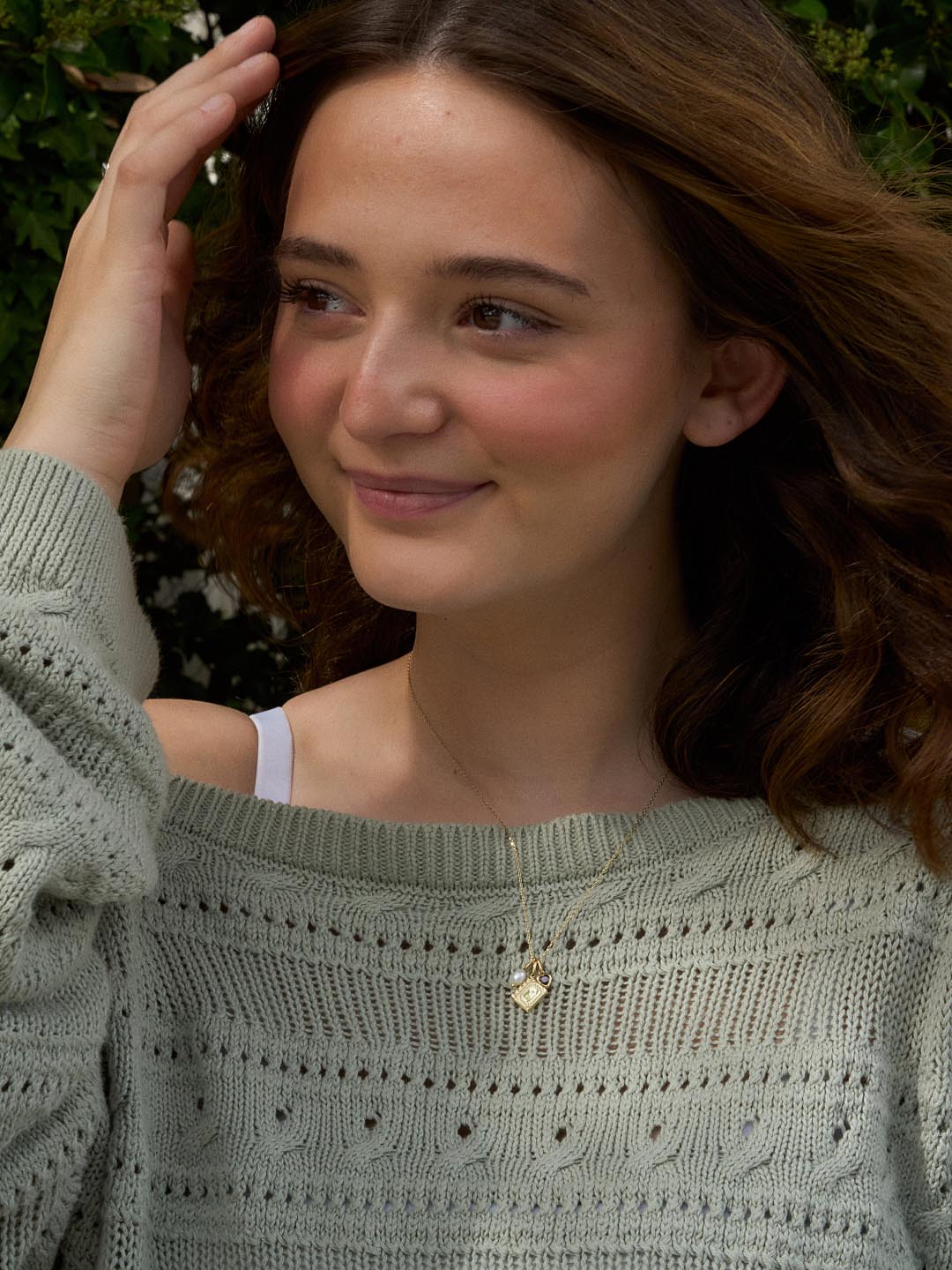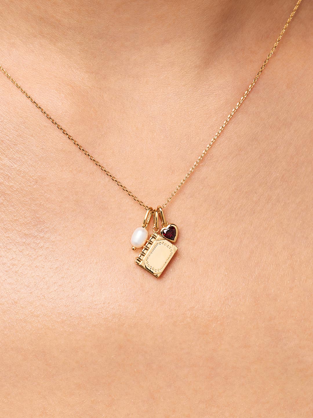 Designed in collaboration with @alexaraye, this charm necklace was made for the bookworms. Plated in 14k gold, this necklace features three unique charms—a puffy heart, a book, and a chic freshwater pearl. Unlike any other necklace, this piece is destined to be a unique addition to both your stack and your jewelry collection. Style this necklace with our Frida huggies for an extra touch of pearl-fection.