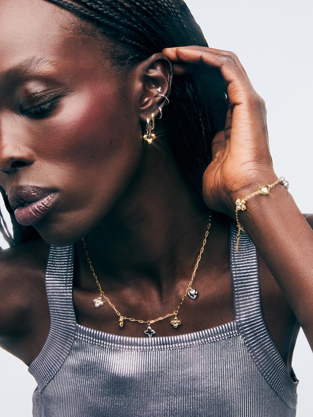 This gold charm bracelet proves that your metals should always be mixed. Plated in 14k gold and rhodium, this bracelet features alternating heart and flower-shaped charms in a playful puffy design. This bracelet is an elevated take on the classic charm style and adds something unexpected to your everyday stack. Pair this piece with our Brynley Bangle to add a bit of elegance to your look.