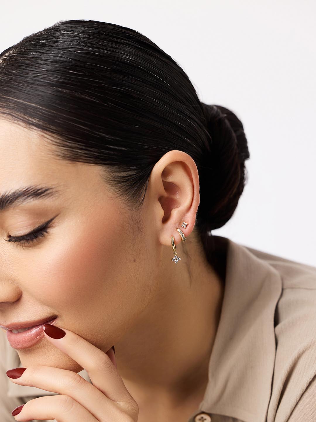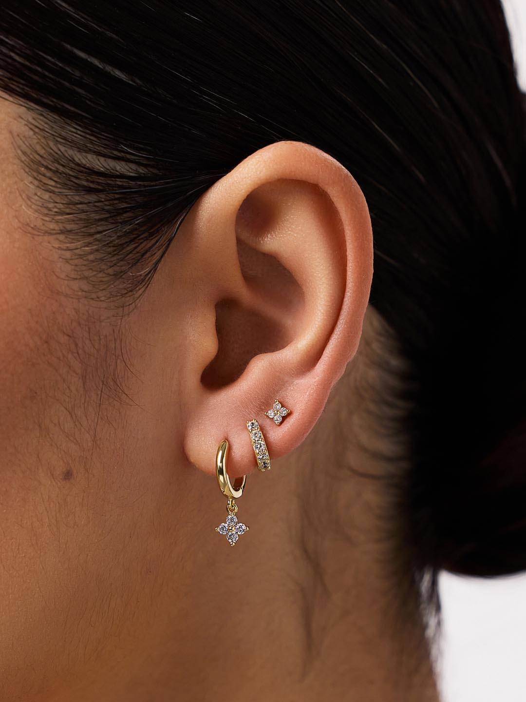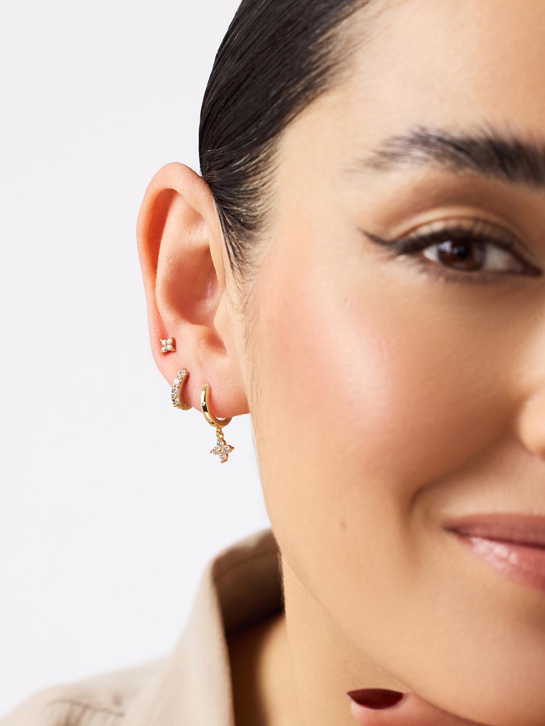 Stand out and shine bright in our Starry Eyed Bundle. This perfectly pre-styled set features two hoops and a pair of studs all plated in 14k gold with beautiful cubic zirconia gemstones. Although this set is made to be styled together, you can also mix-and-match them with any of our bold huggies or studs for an eye-catching look.
