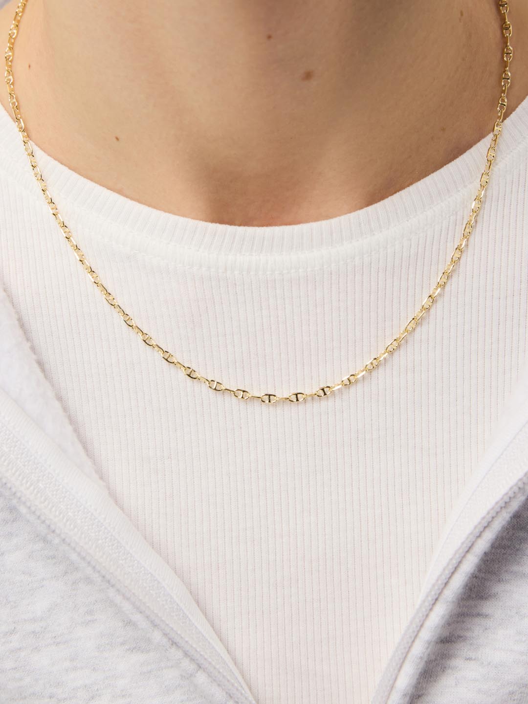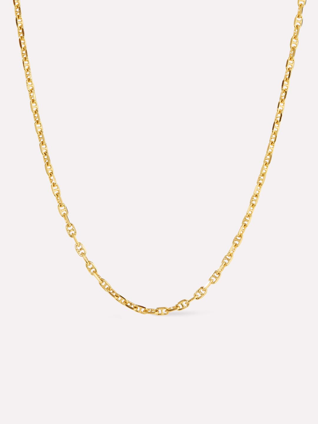 Add a unique touch to your look with this anchor chain necklace. Plated in 14k gold, this sleek necklace features a unique linked design reminiscent of an anchor. Although this necklace may be minimal, it makes a maximum impact in every stack. Pair this necklace with our Iver ring for a put together look.