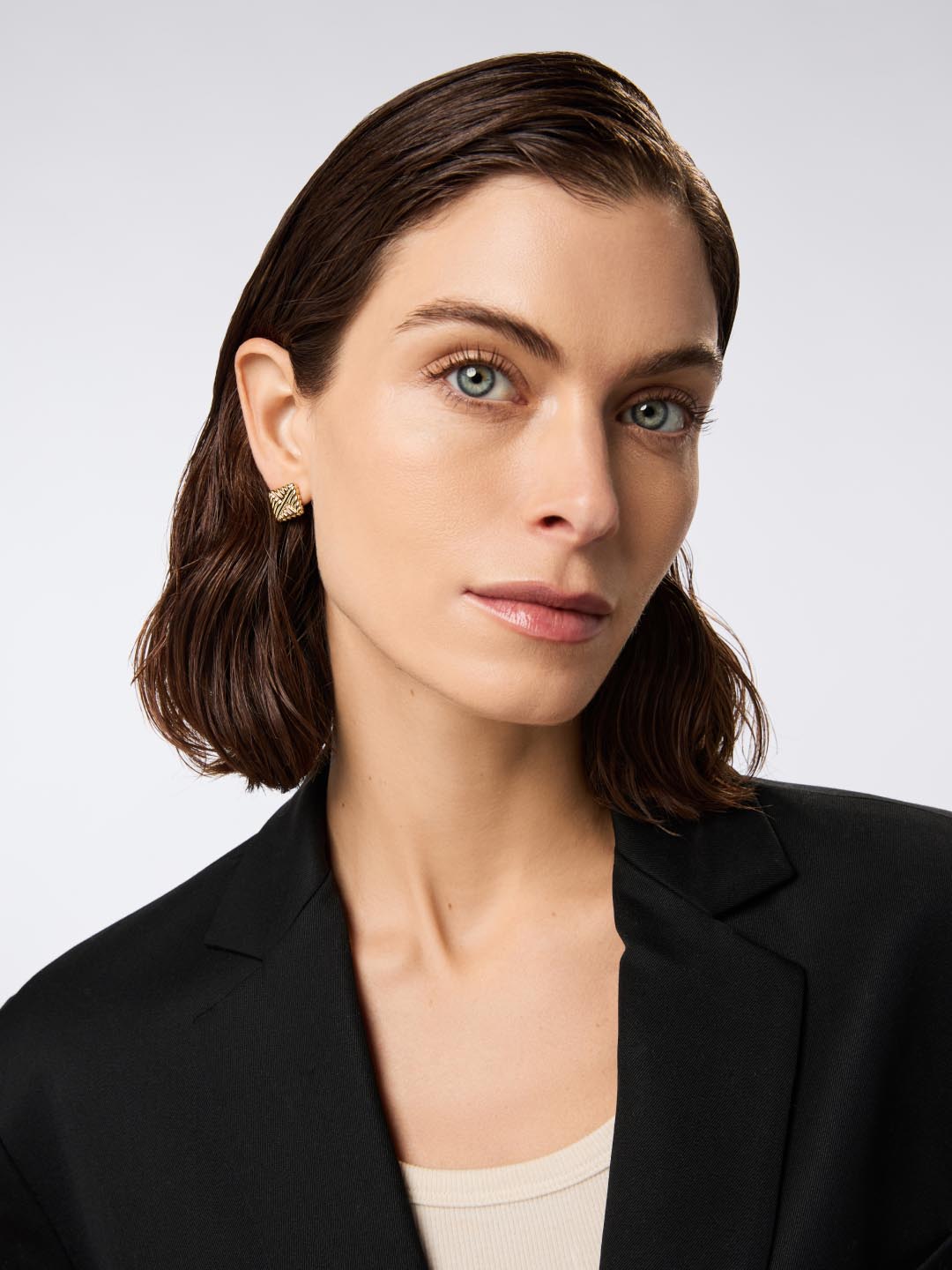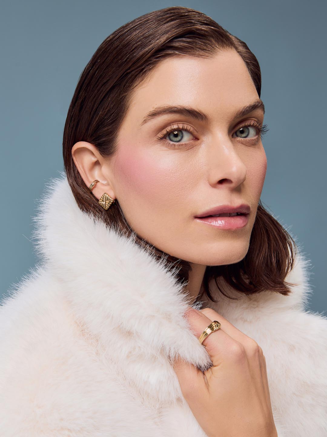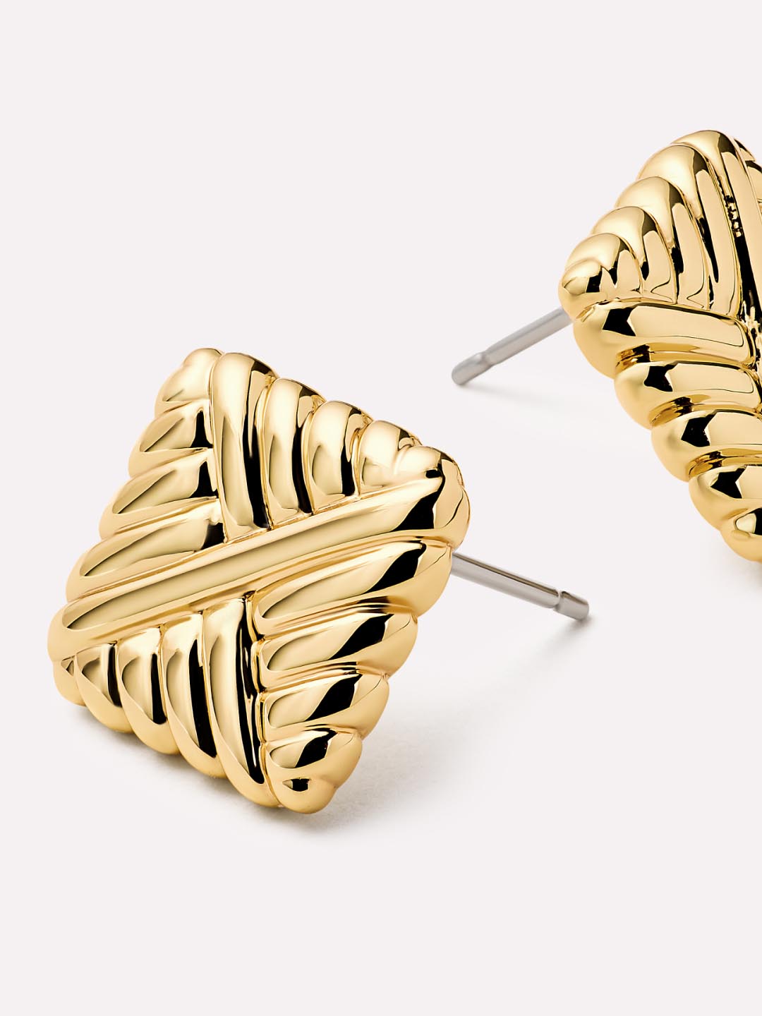 These gold stud earrings add a timeless touch to every stack. Plated in 14k gold, these studs feature a bold yet wearable silhouette and unique texture for added elevation. Perfect for day or night, these earrings are fab on their own but also look great paired with our Elsie necklace for an even more textured look.