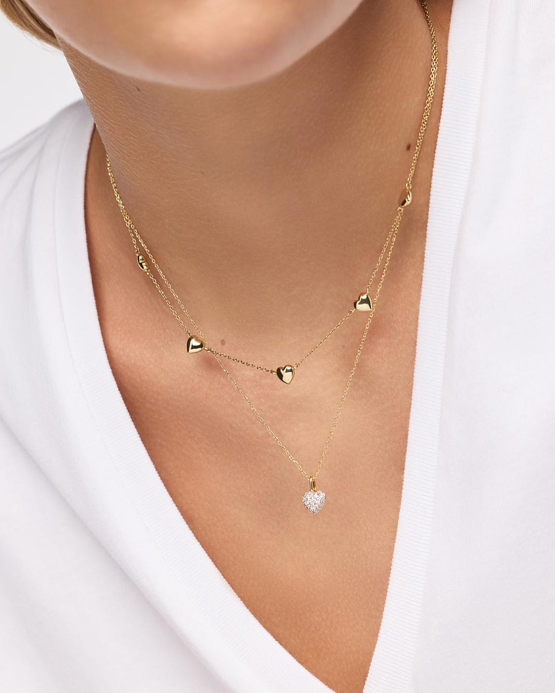 • Puffy hearts stationed on chain