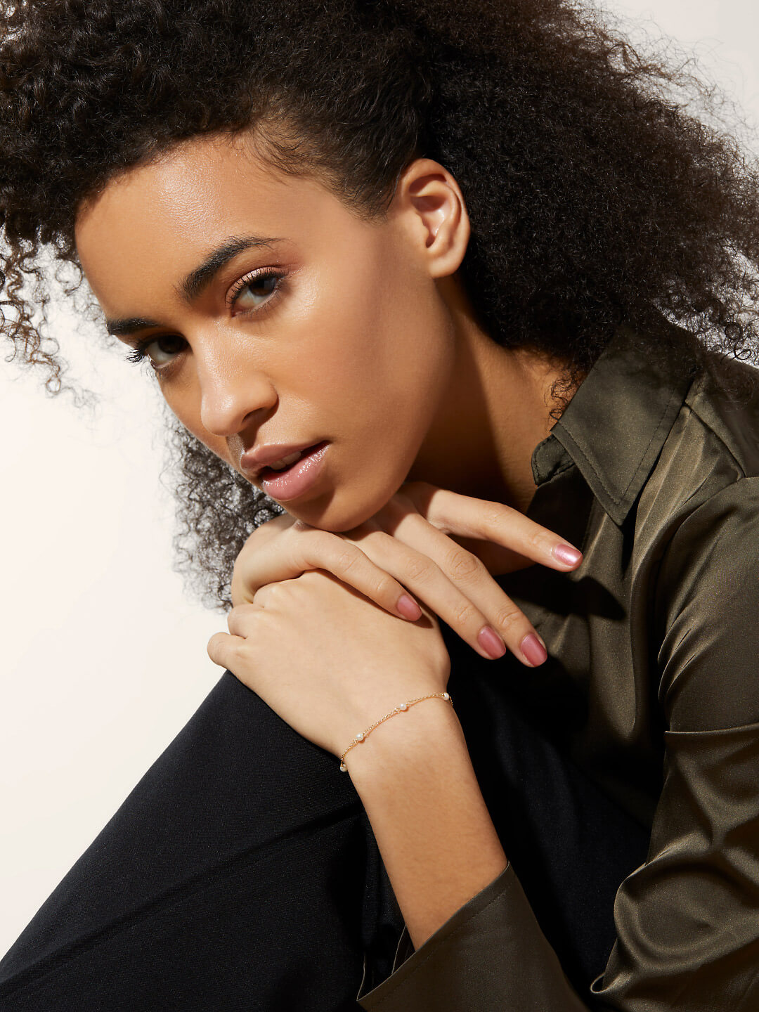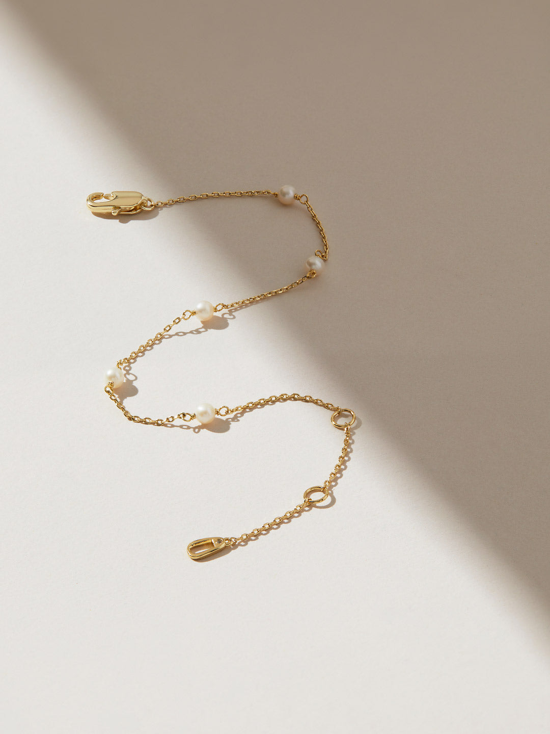 More than just your grandma’s hand-me-downs, this pearl station bracelet is our modern take on a 1980s classic. This dainty must-have bracelet is dipped in 14K gold and adorned with five freshwater pearls. Your arm candy isn’t complete without its main course: pearls. So go ahead and start your stack off strong with the Adelie pearl station bracelet then layer on some fan favorites like our Rowena and Lisa bracelets.
