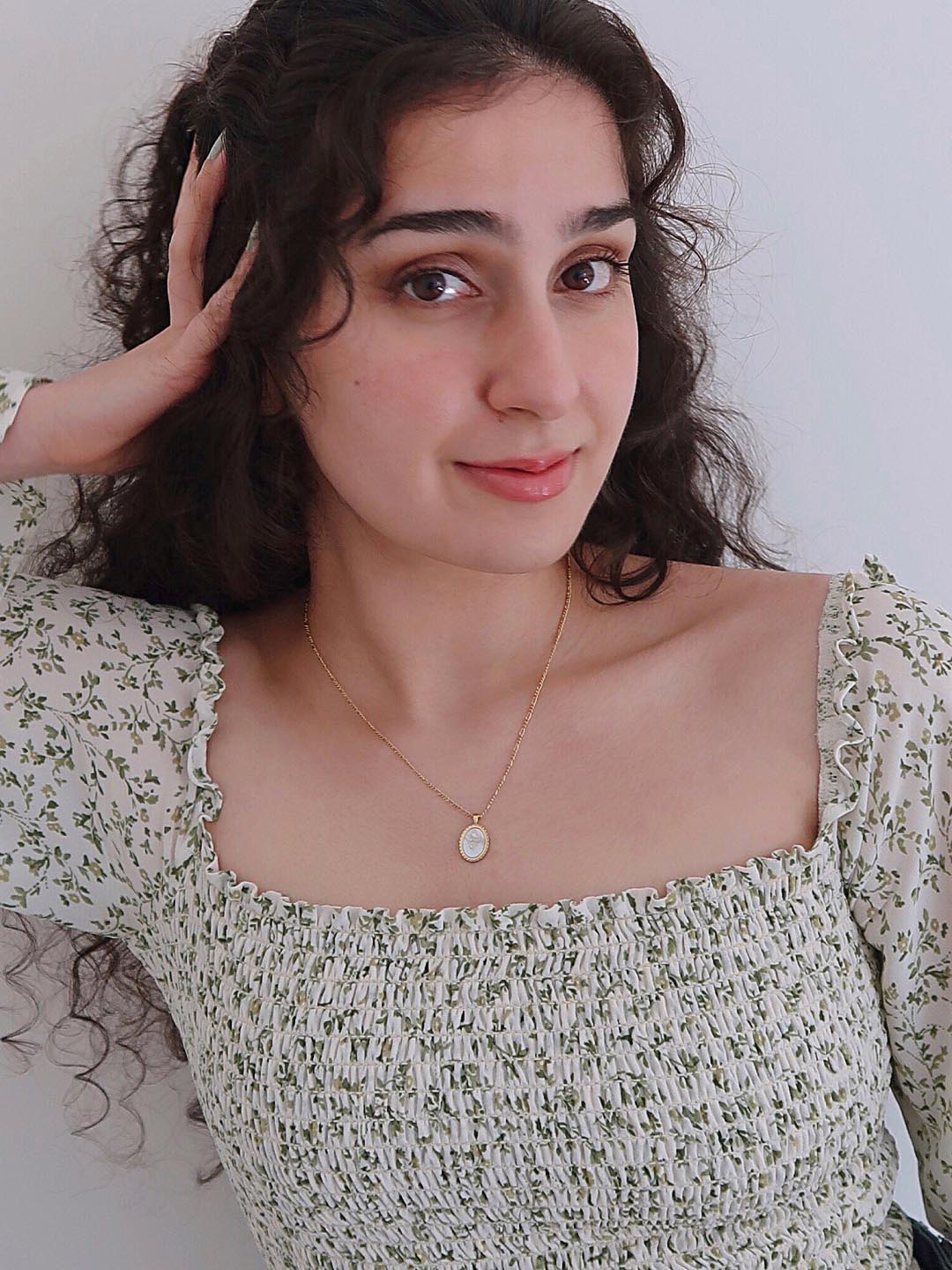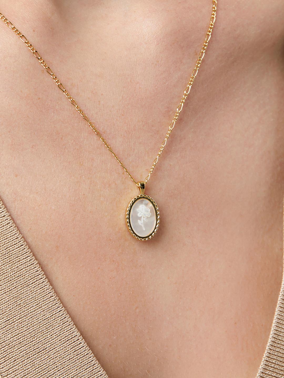 Add a vintage inspired flair to your outfit with this gorgeous engraved necklace designed by Hannah. With its iridescent Mother-Of-Pearl disc pendant and rose etching, this elegant necklace is a fresh take on your beloved family heirloom. Dipped in 14K Gold and featuring a stylish Figaro chain, this rose engraved necklace will look perfect with pearl studs for a chic, preppy look.