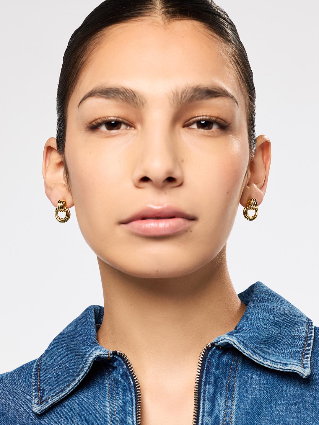 These statement earrings are here to add something eye-catching to your next ear stack. Plated in 14k gold, these earrings feature a chunky design with multiple rings for a unique finishing touch. Style these earrings with a pair of sparkly studs, like our Suzanne huggies, for a bold and sparkly look.