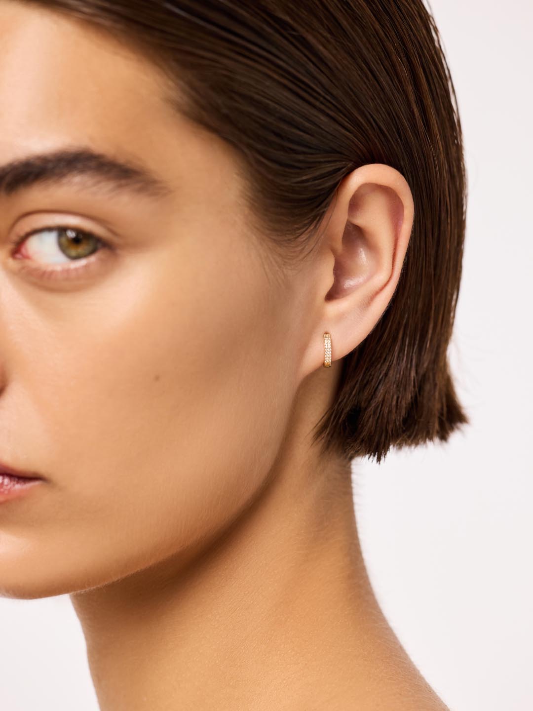 These diamond hoop earrings are proof that you can never wear too many diamonds. Crafted in recycled solid gold, these waterproof huggies feature a thick silhouette with two rows of radiant lab-grown diamonds. Create the perfect solid gold ear stack and style these huggies with our mini Gold Classic Hoops.