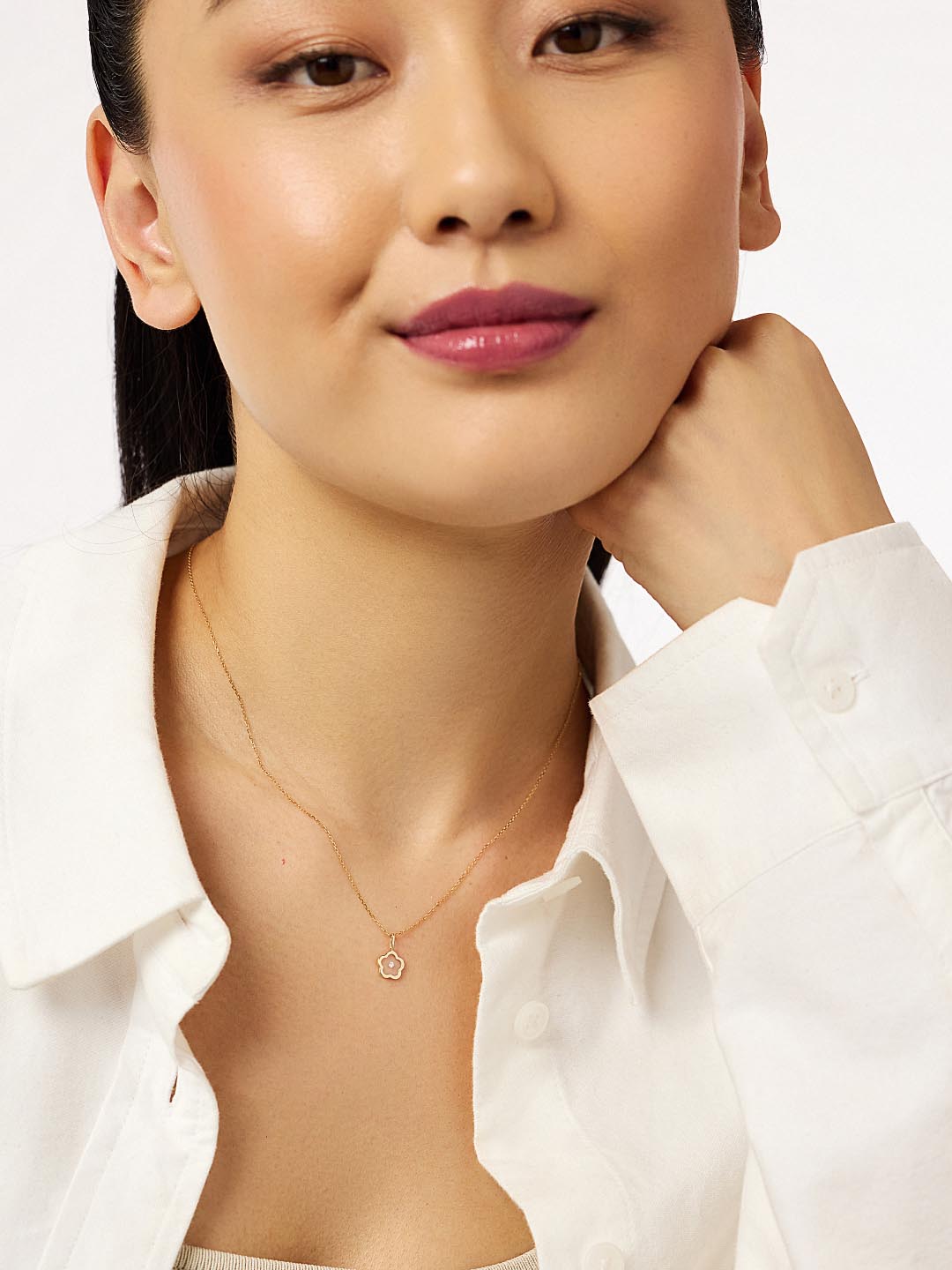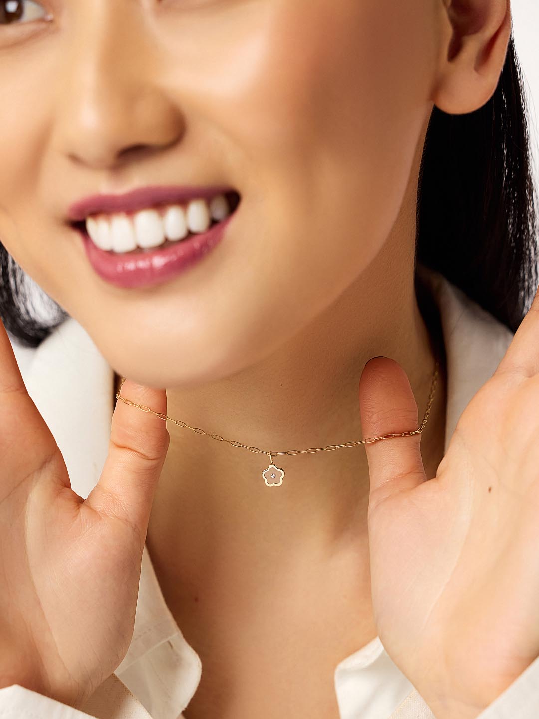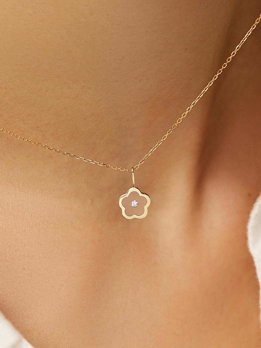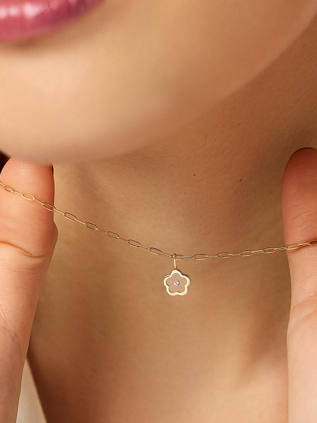 This missing piece to your chain. This gold pendant is crafted in waterproof solid gold and features a playful flower-shaped silhouette with a floating lab-grown diamond at it's center. Designed to be paired with our solid gold chains, this charm adds a sparkly touch to your favorite stack.