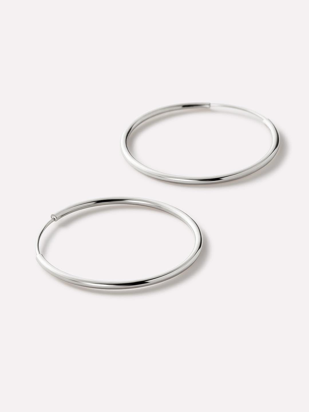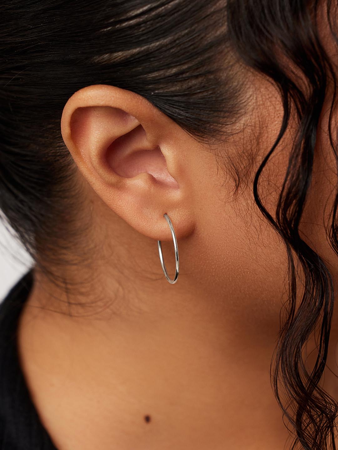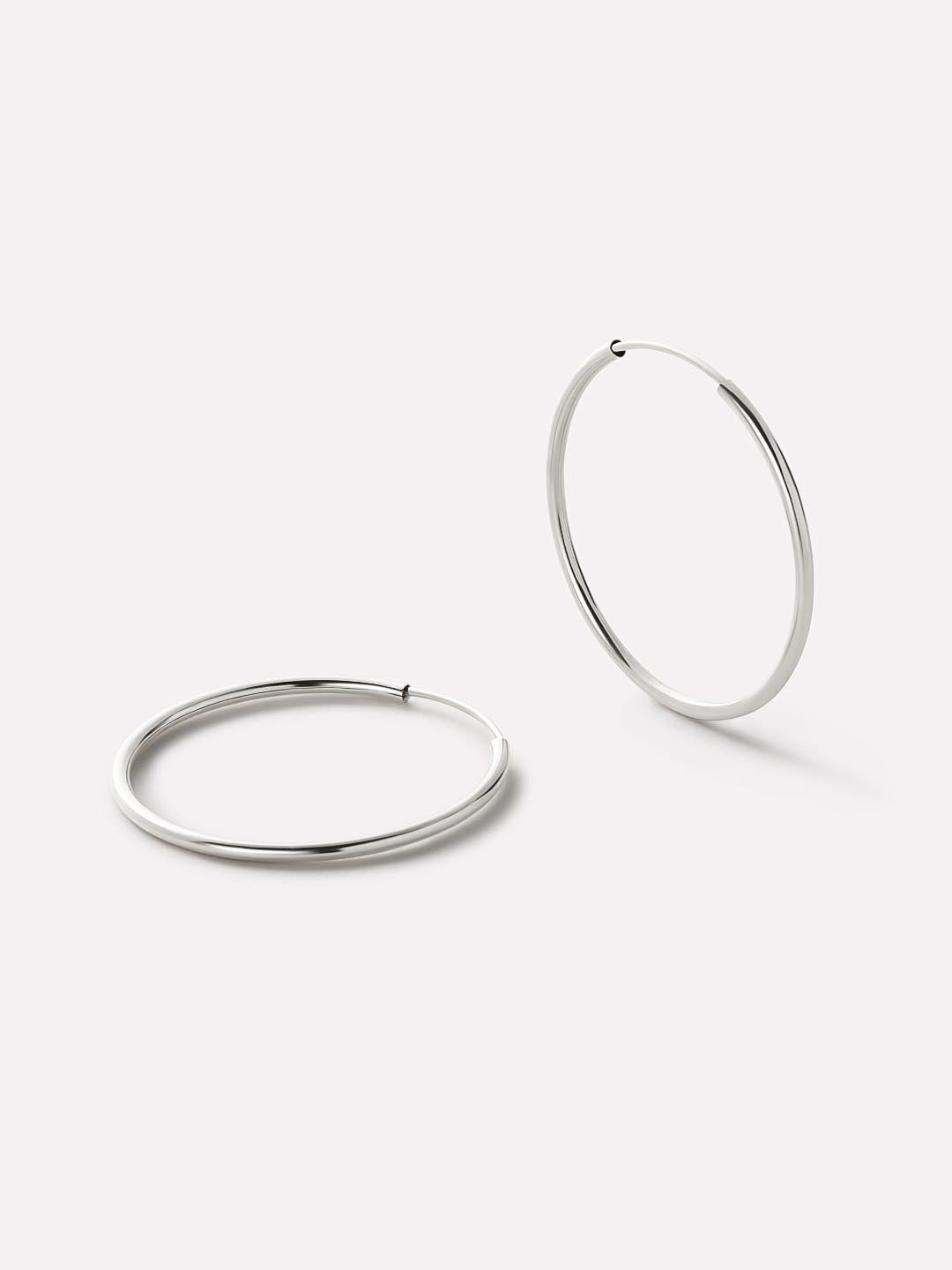 A seriously solid pick, these white gold hoop earrings are ones you’ll wear for years to come. Crafted in waterproof, solid-white-gold, these large hoops feature a slim silhouette and shiny finish. Wear them alone or pair them with our Cassie earrings for the perfect stud-hoop combo.
