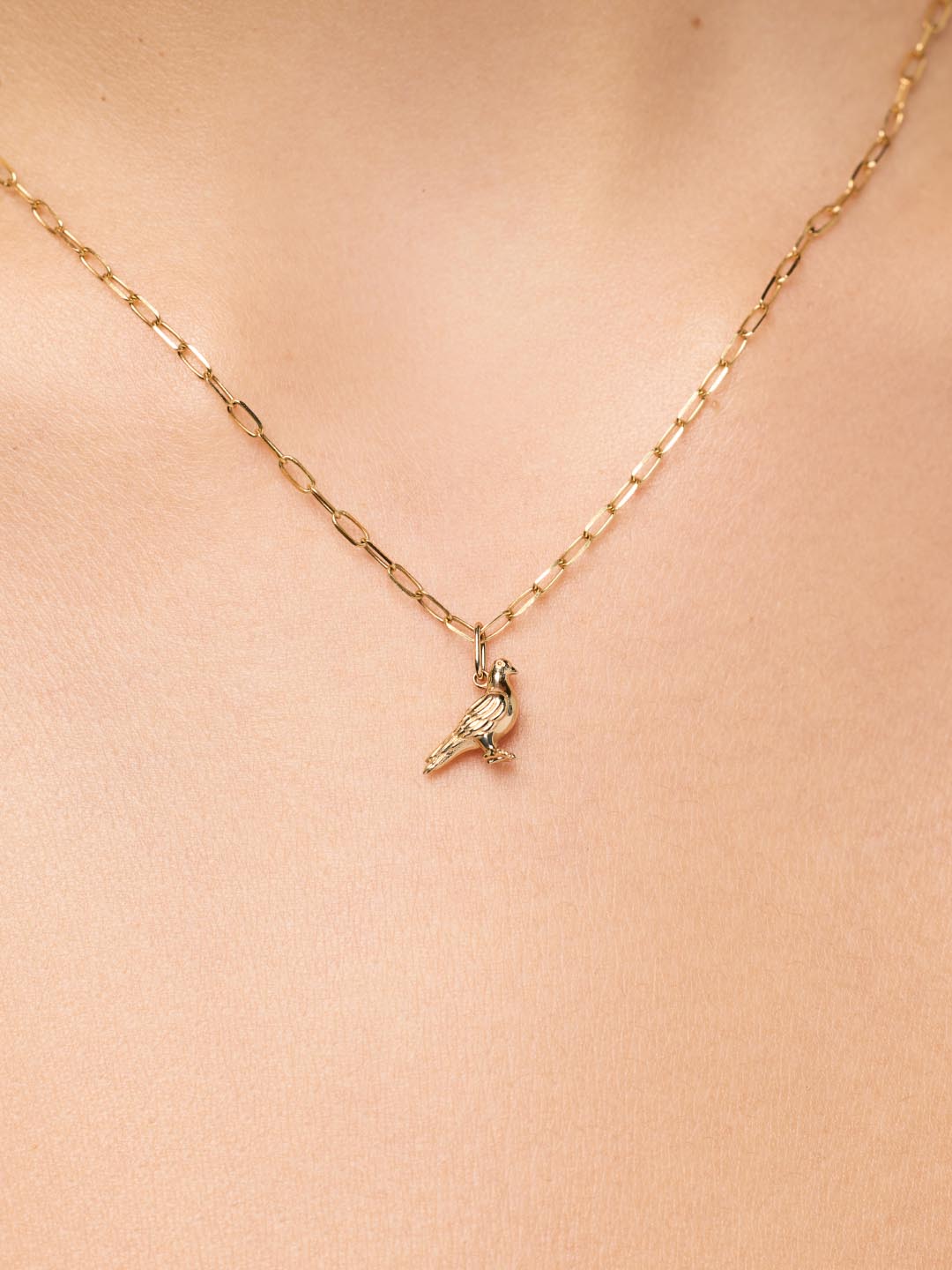 Perfectly playful, this solid yellow gold charm is a fun addition to any jewelry collection. Crafted in recycled solid gold, this charm features a pigeon-shaped design with textured detailing for an elevated finishing touch. Slide this charm onto our Gold Paperclip Necklace and wear it solo or with your other favorite charms for a fun look.